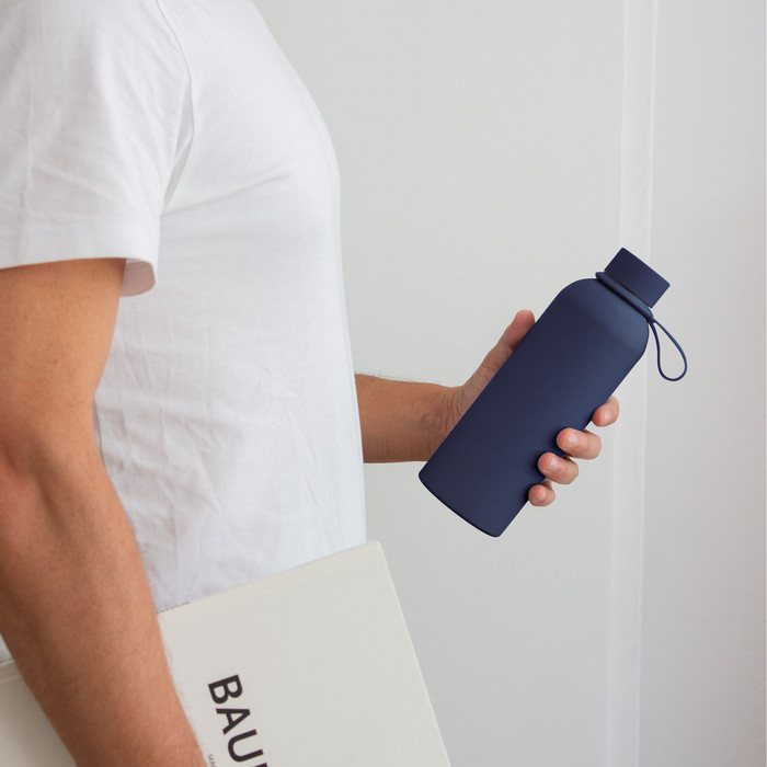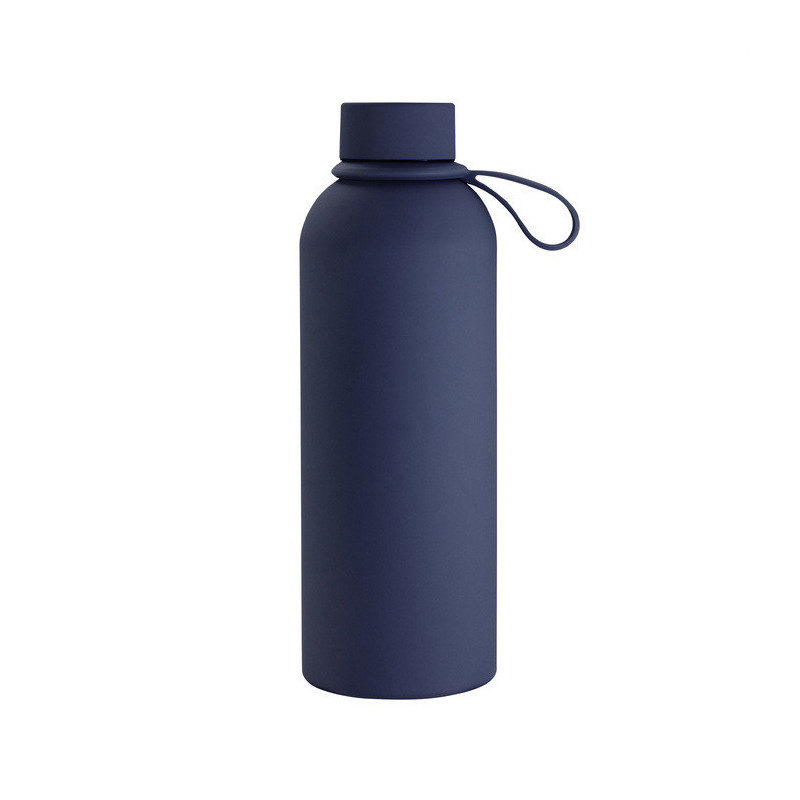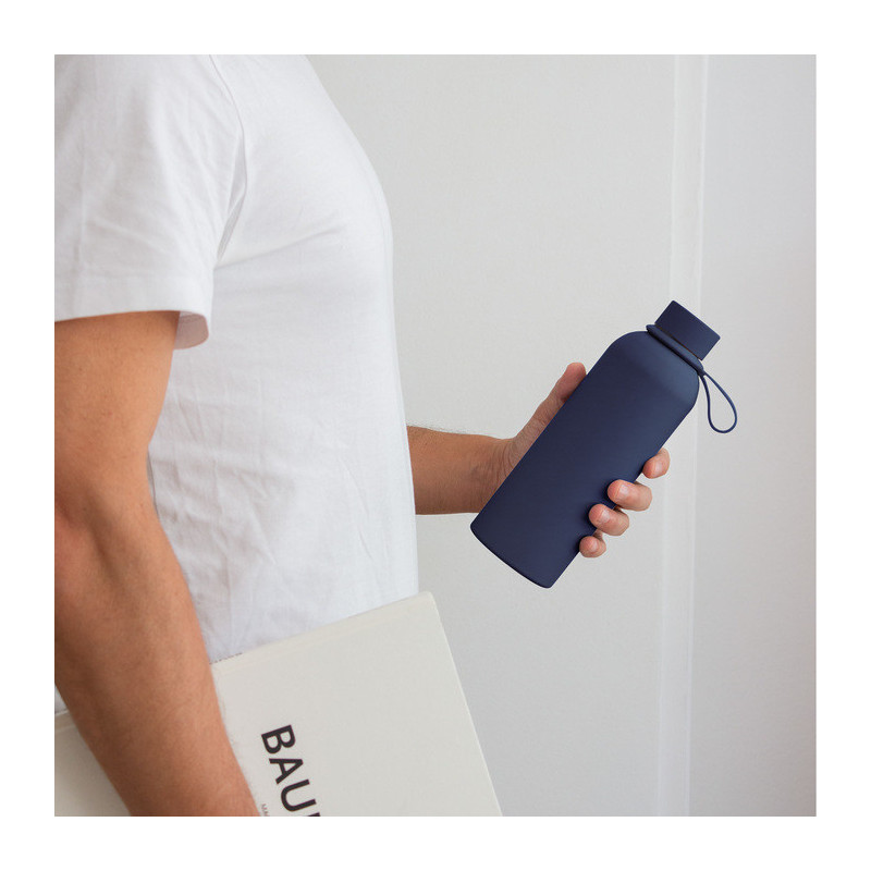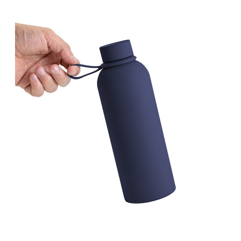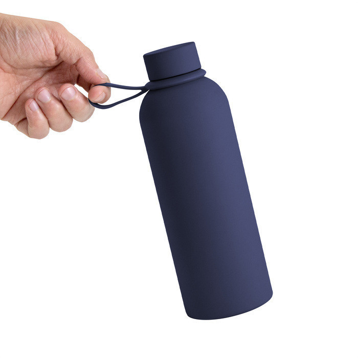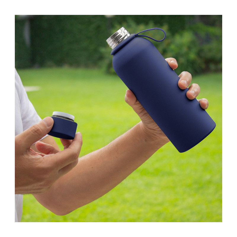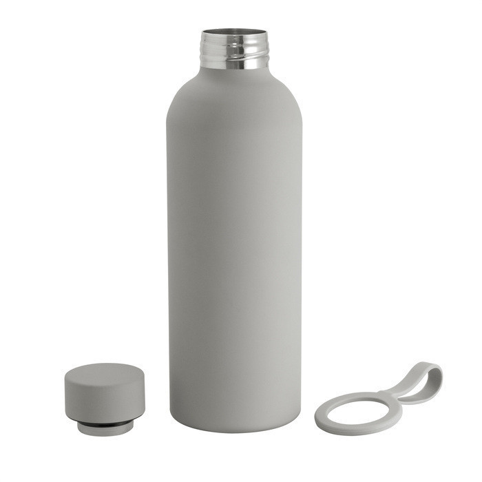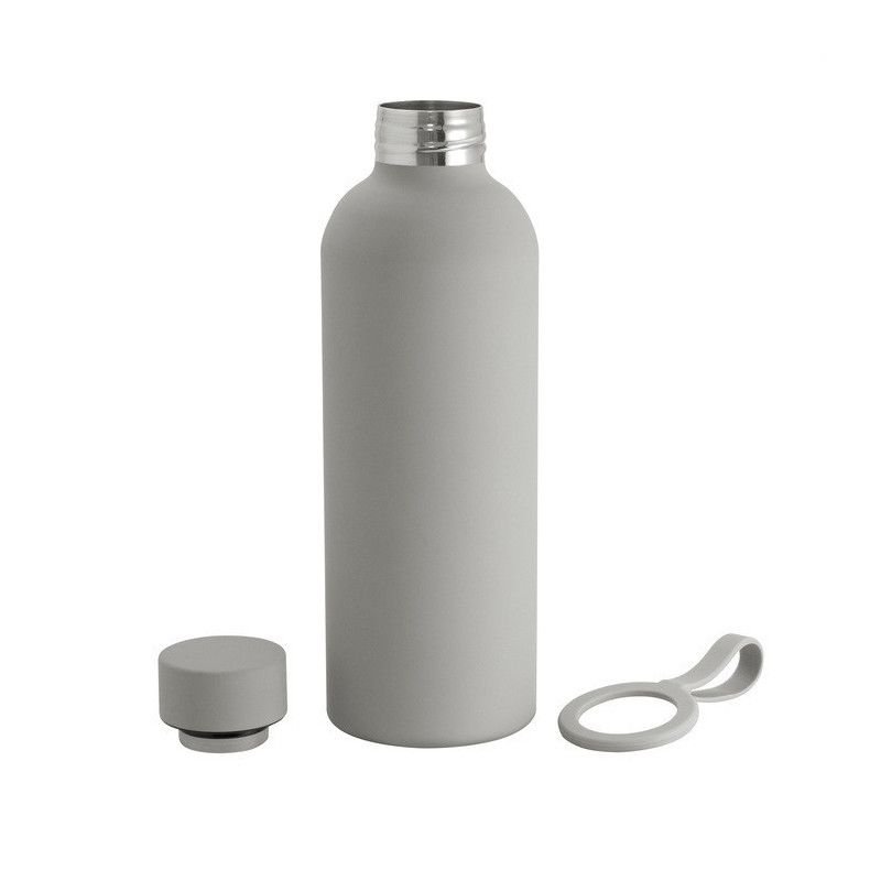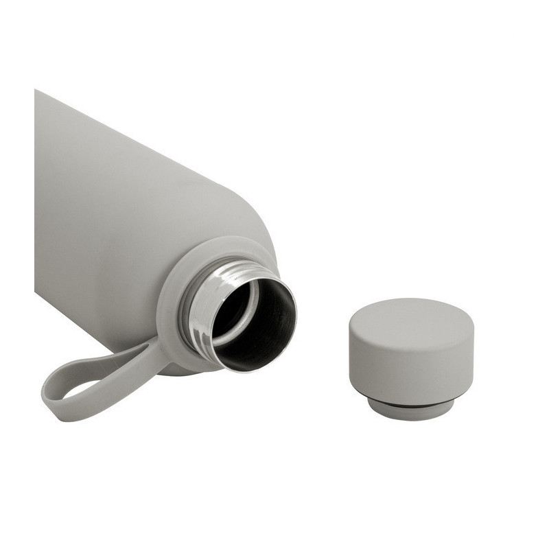 Botella doble pared, sellada al vacío. Interior de acero 304 y exterior de acero 201. Tapa a rosca de acero 201, interior plástico con anillo de silicona. Asa de silicona para un transporte fácil. Pintura con terminación suave al tacto. Mantiene hasta 6 hs la temperatura de las bebidas calientes y 12 hs de las bebidas frías.