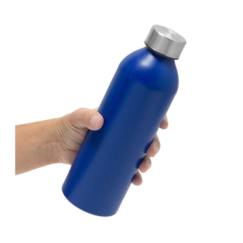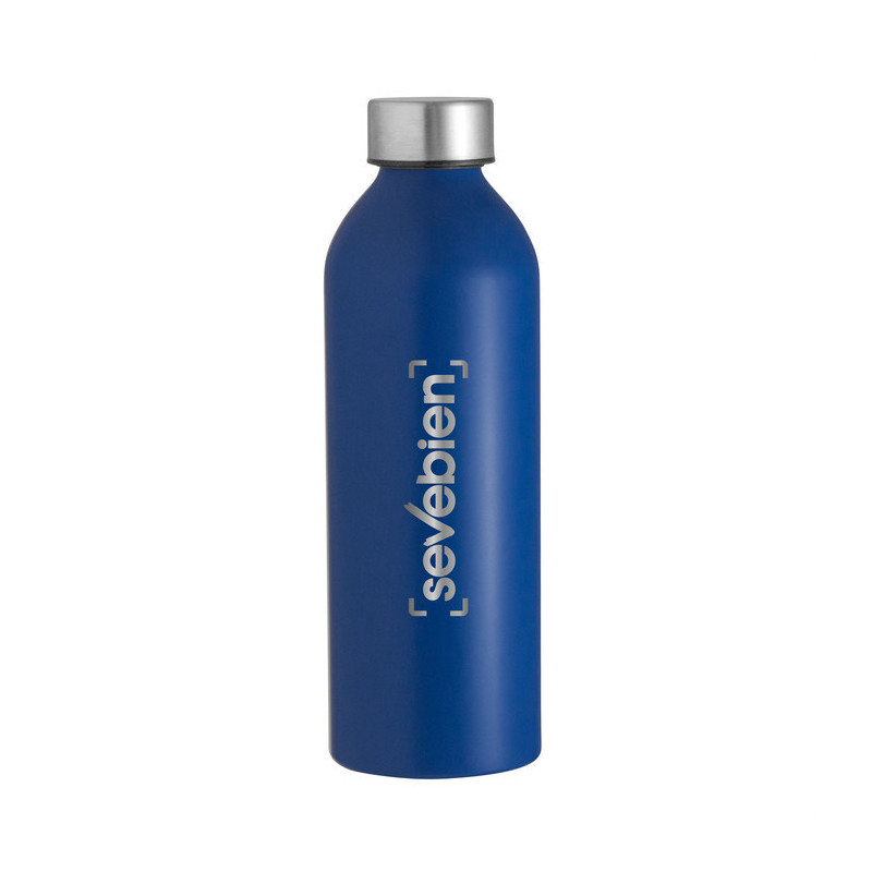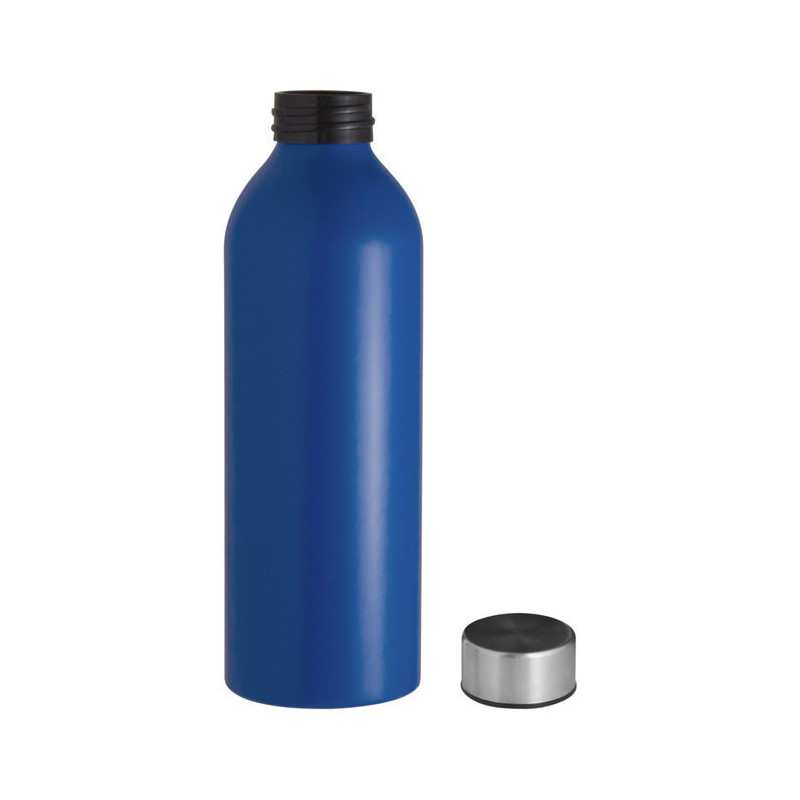 Capacidad 750 ml. Aluminio. Botella de aluminio con acabado mate. Tapa a rosca color plata en acero inoxidable 201 y anillo de silicona antiderrame.