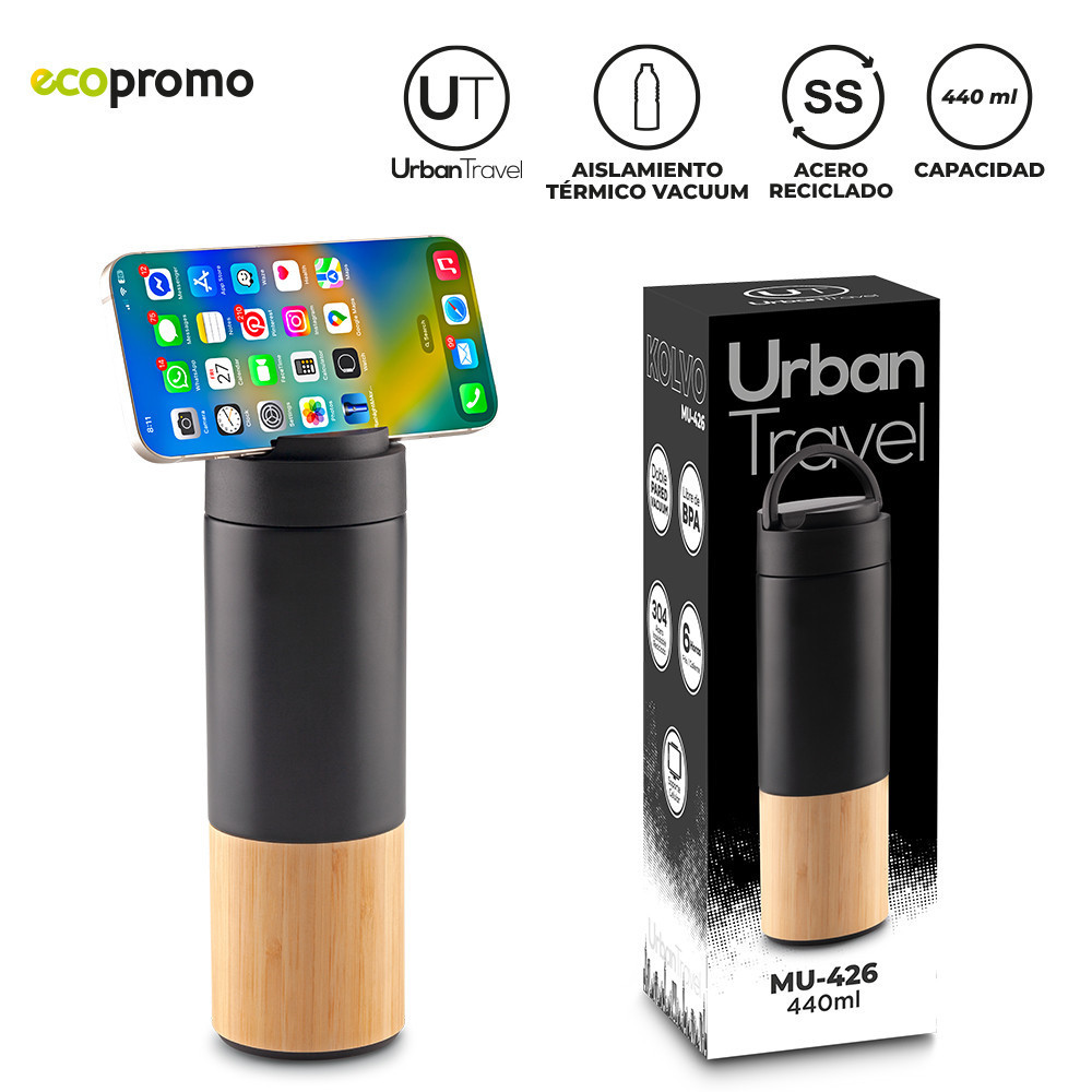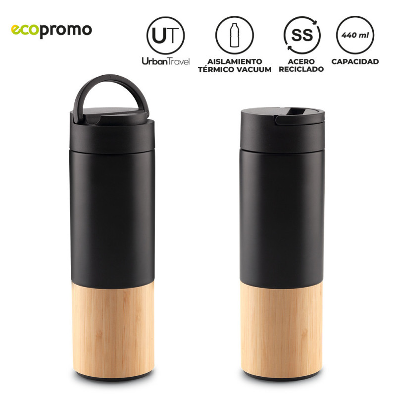 Botilito doble pared vacuum en acero inoxidable reciclado, con aislamiento térmico que mantiene la bebida fría o caliente hasta 6h aprox (puede variar dependiendo de las condiciones climáticas). con capacidad para 440 ml. Tapa plástica tipo rosca. La tapa funciona como soporte para celular. Empaque caja individual.