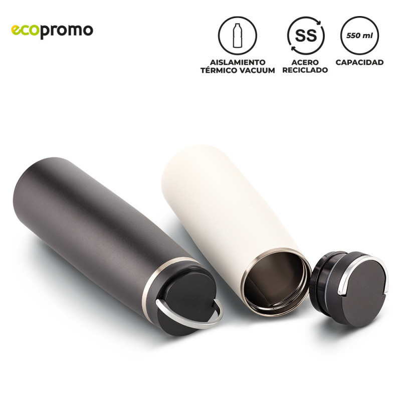 Botilito metálico doble pared vacuum en acero inoxidable reciclado, con aislamiento térmico que mantiene la bebida fría o caliente hasta 6h aprox (puede variar dependiendo de las condiciones climáticas). Tapa plástica tipo rosca. Empaque caja individual.