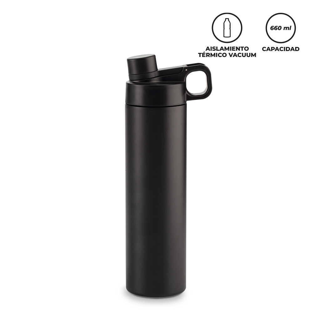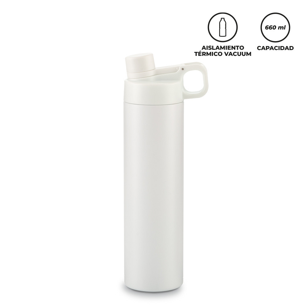 Botilito metálico doble pared vacuum en acero inoxidable, con aislamiento térmico que mantiene la bebida fría entre 8-10h aprox o caliente 3-4h aprox (puede variar dependiendo las condiciones climáticas). Tapa rosca plástica. Empaque caja individual.