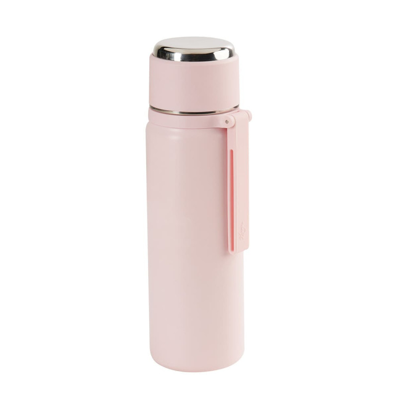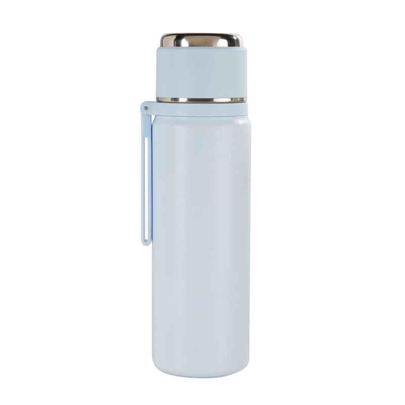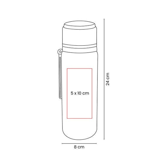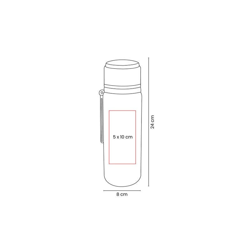 Termo doble pared. Cerrado al vacio. Pared interna y externa acero inoxidable. Tapa de plastico con sistema de rosca, boquilla y boton de seguridad para mantener cerrado y sin derrames, incluye sobretapa metalica de rosca. Cuenta con un asa de silicon para llevarlo facilmente a donde quiera que vayas. Mantiene la temperatura caliente por 12 hrs y la temperatura fria por 24 hrs. Capacidad de 17 Oz. Incluye caja individual.