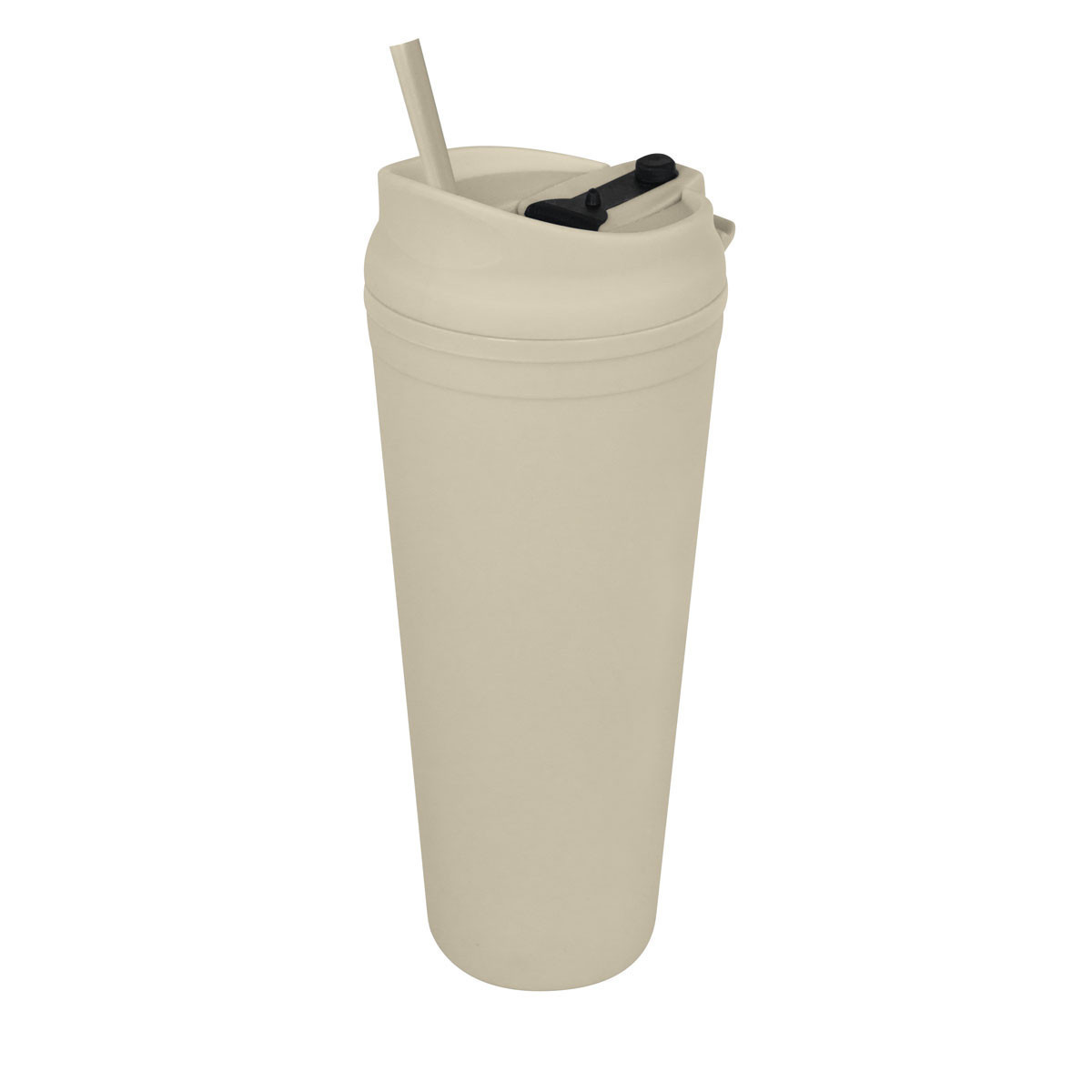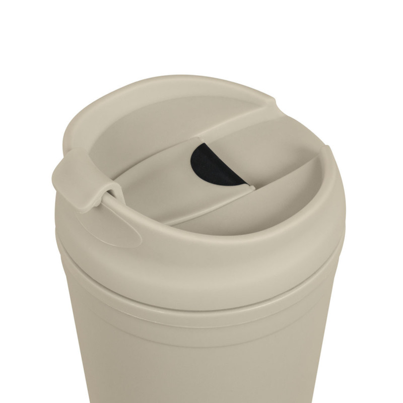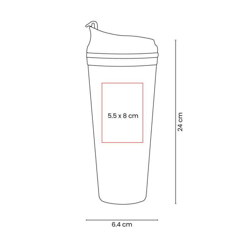Doble pared. Pared interna y externa de plástico. Tapa de plástico con sistema de rosca. Sobre tapa con sistema de push. Incluye popote. Cuerpo y tapa con terminado tipo rubber. Caja individual incluida.