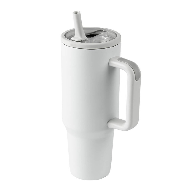 Termo doble pared. Cerrado al vacio. Pared interna y externa de acero inoxidable. Tapa de plastico con cierre de rosca que incluye boquilla con popote. Capacidad de 40 Oz. Base de 7.6 cm de diametro. Incluye caja individual.