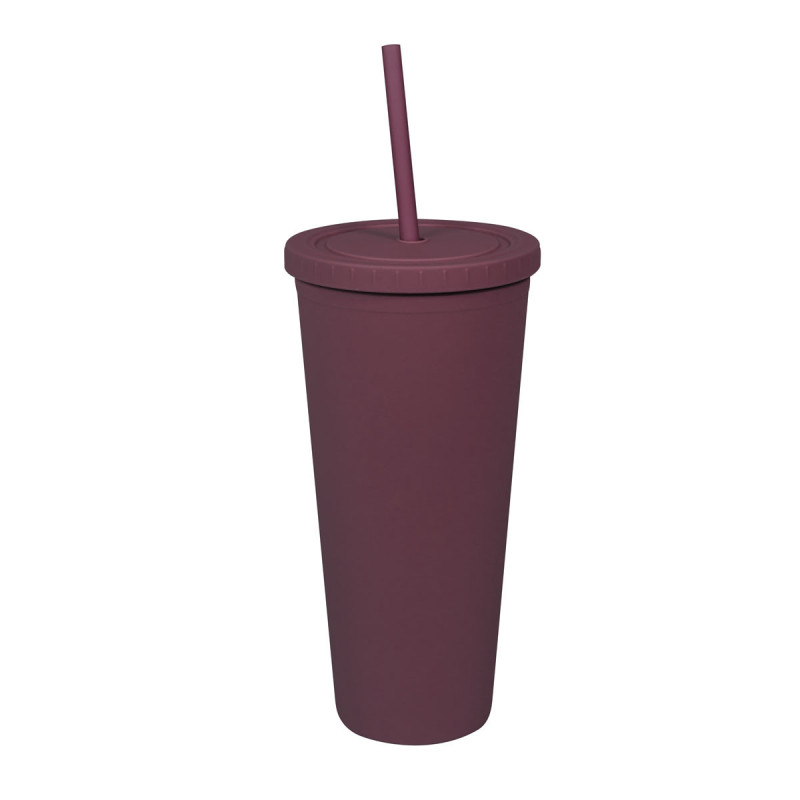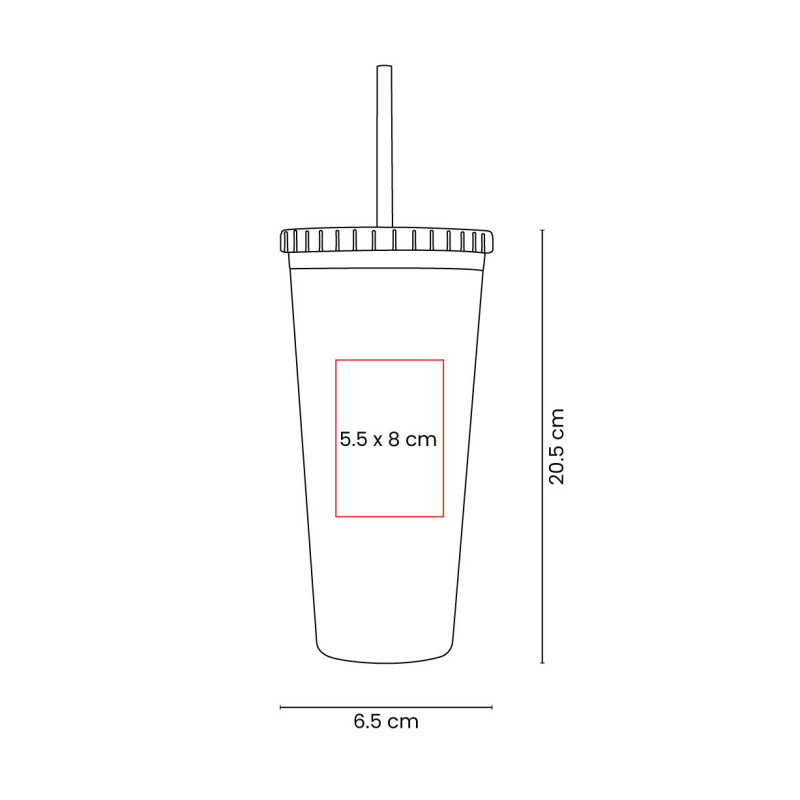 Doble pared. Pared interna y externa de plástico. Tapa de plástico con sistema de rosca. Incluye popote. Cuerpo y tapa con terminado tipo rubber. Capacidad 22 Oz. Base de 6.6 cm de diámetro. Caja individual incluida.