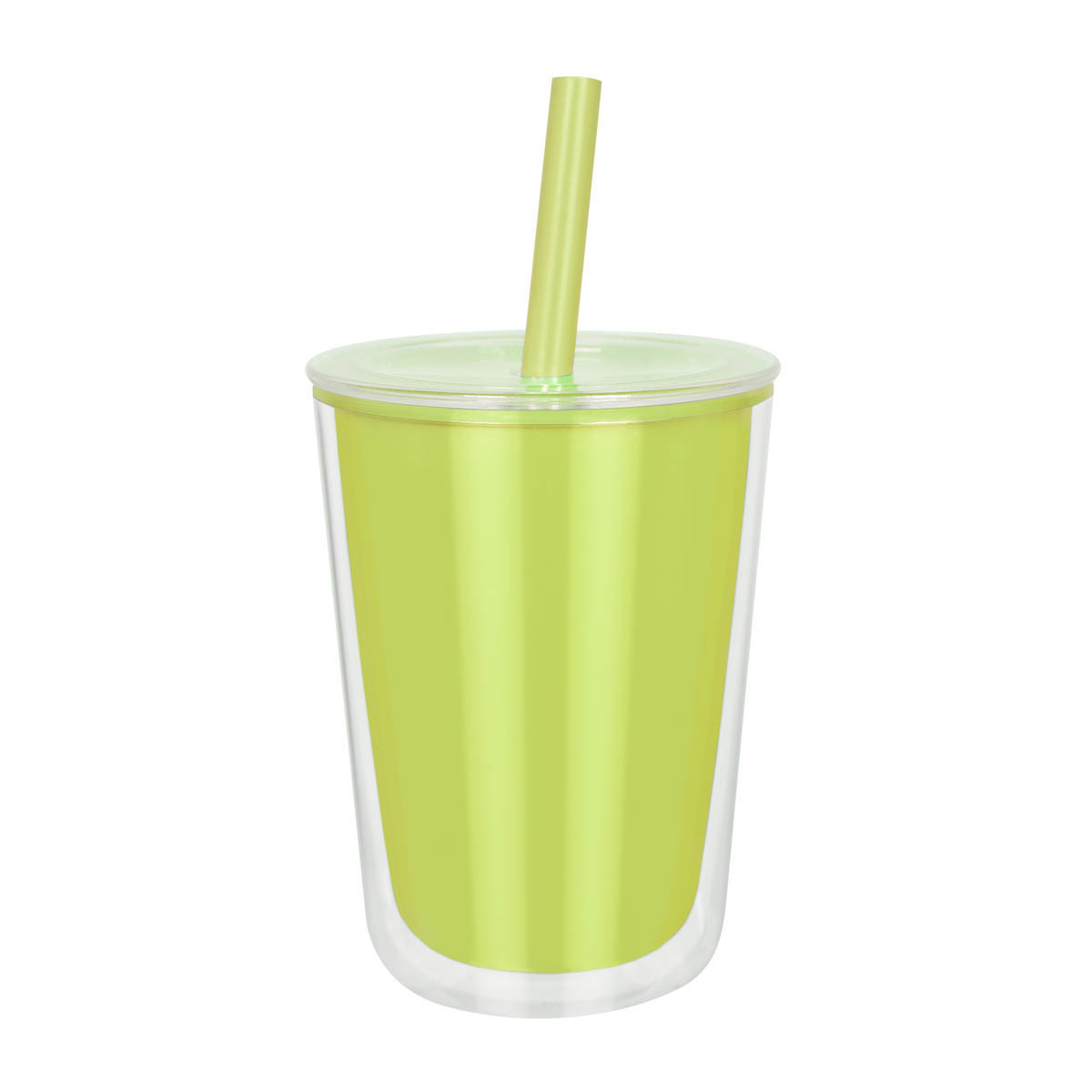 Vaso de plastico doble pared. Su peculiar diseno, cuenta con una pared interna de color y una pared externa transparente, que le da un aspecto moderno y vibrante. La tapa con cierre push y el popote a juego, anaden originalidad a este vaso. Ideal para llevar tus bebidas favoritas a donde vayas. Capacidad de 23 Oz. Base de 9 cm de diametro. Incluye caja individual.