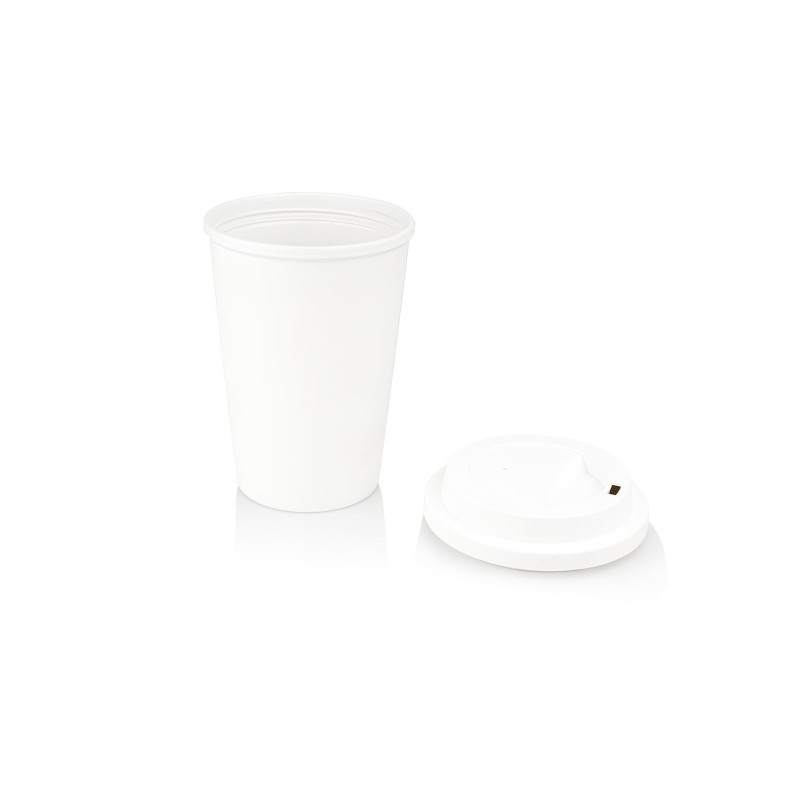 Vaso para café con tapa elaborado en paja de trigo. Tiene una capacidad de 450 ml y una temperatura recomendada de ≤60°C.