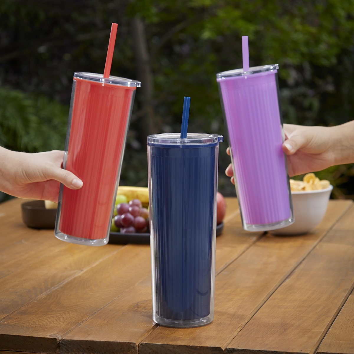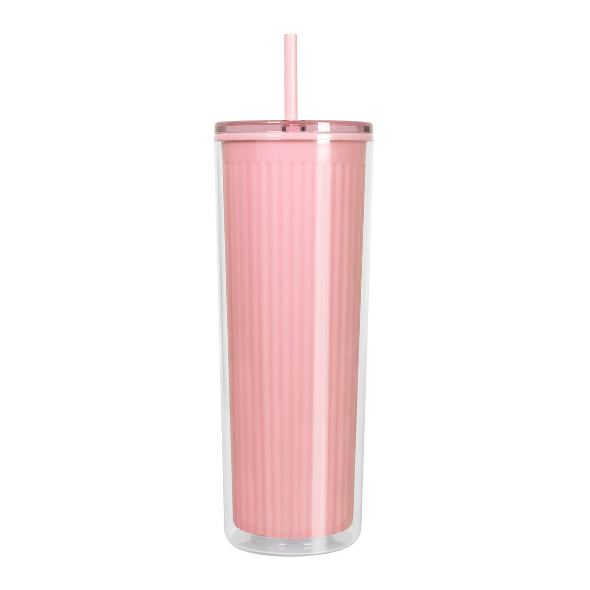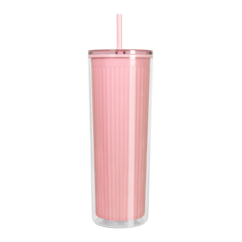Termo de plastico doble pared. Pared interna de color, texturizada a rayas, y pared externa lisa y transparente que, en conjunto, ofrecen un diseno moderno y vibrante. Incluye tapa de plastico con sistema push y popote a juego. Capacidad de 22 Oz. Base de 7.5 cm de diametro. Incluye caja individual.