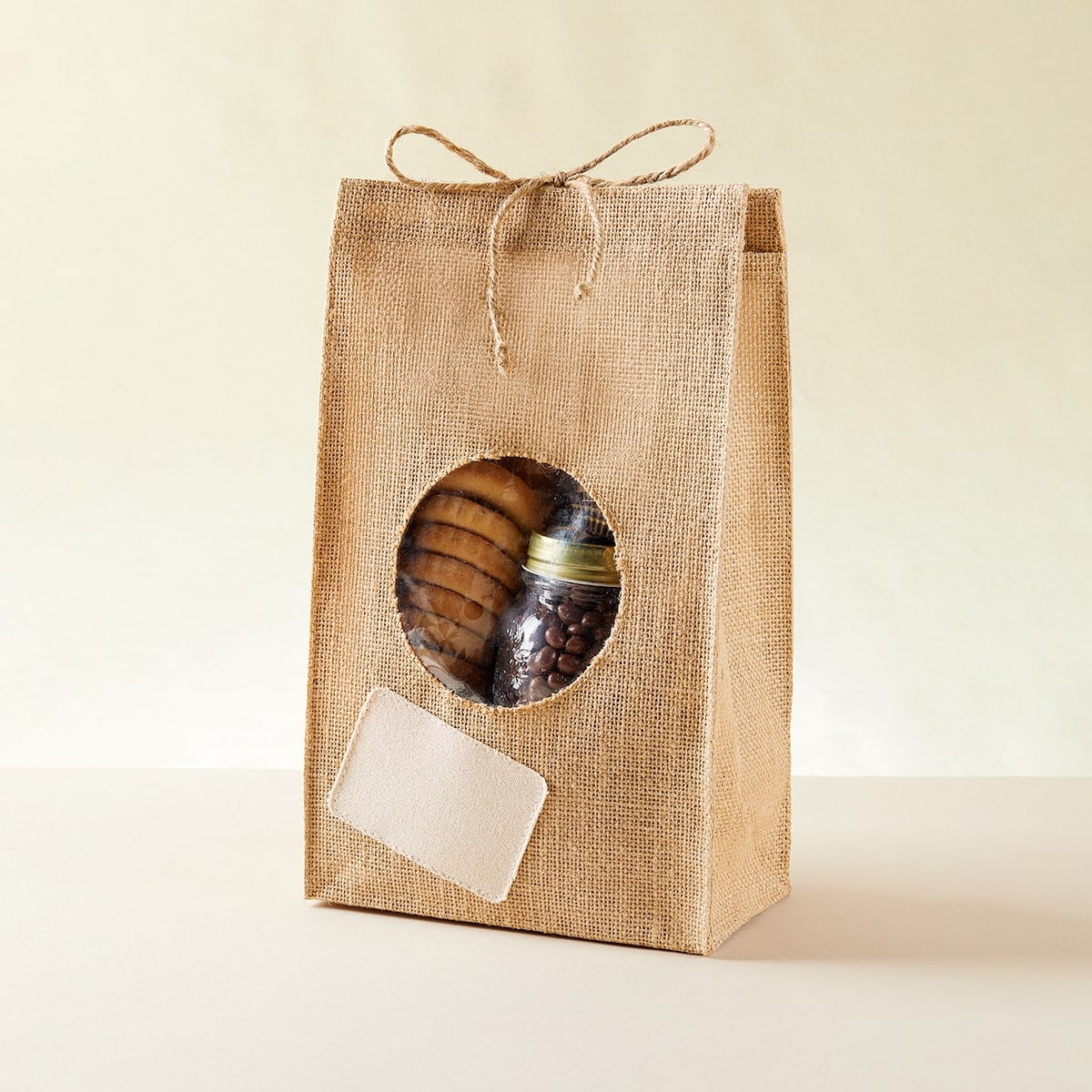 Bolsa de yute laminada. Cierre de cordón. Ventana de PCV y parche de algodón para impresión. El yute es un producto natural el cual puede presentar variaciones en tonalidades y en la urdimbre y trama de la tela.