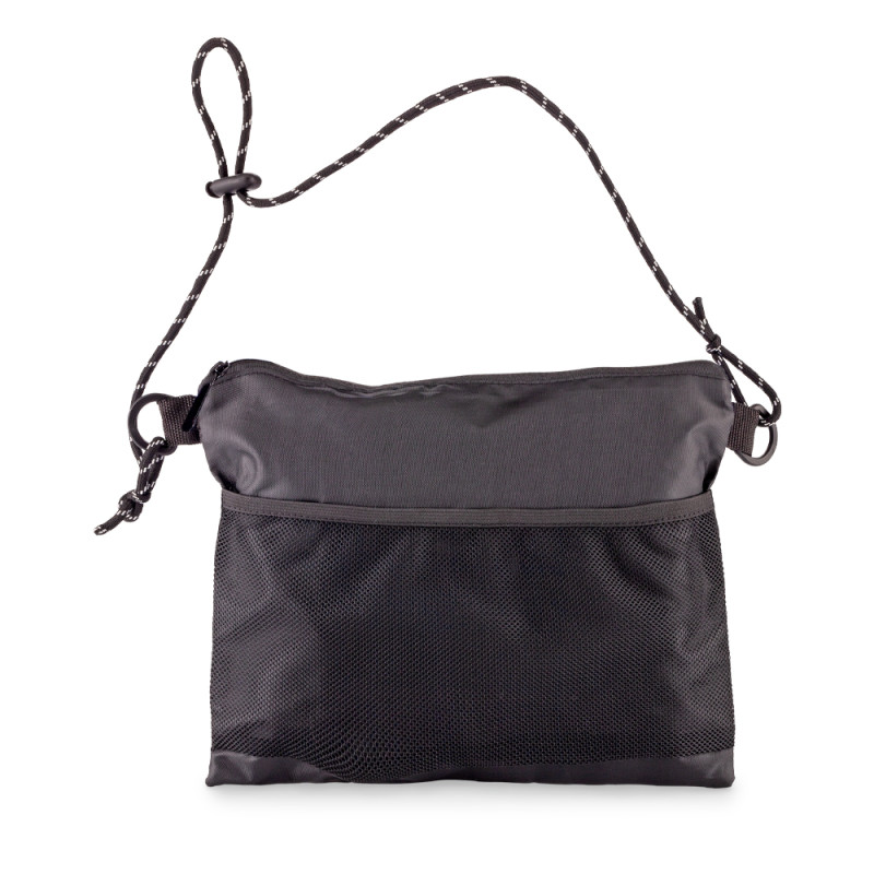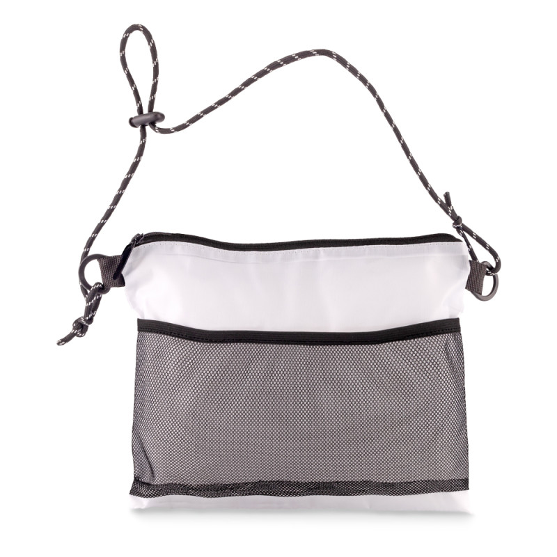 Bolsa en poliéster para viajes. Con dos bolsillos externos y uno interno con cremallera.