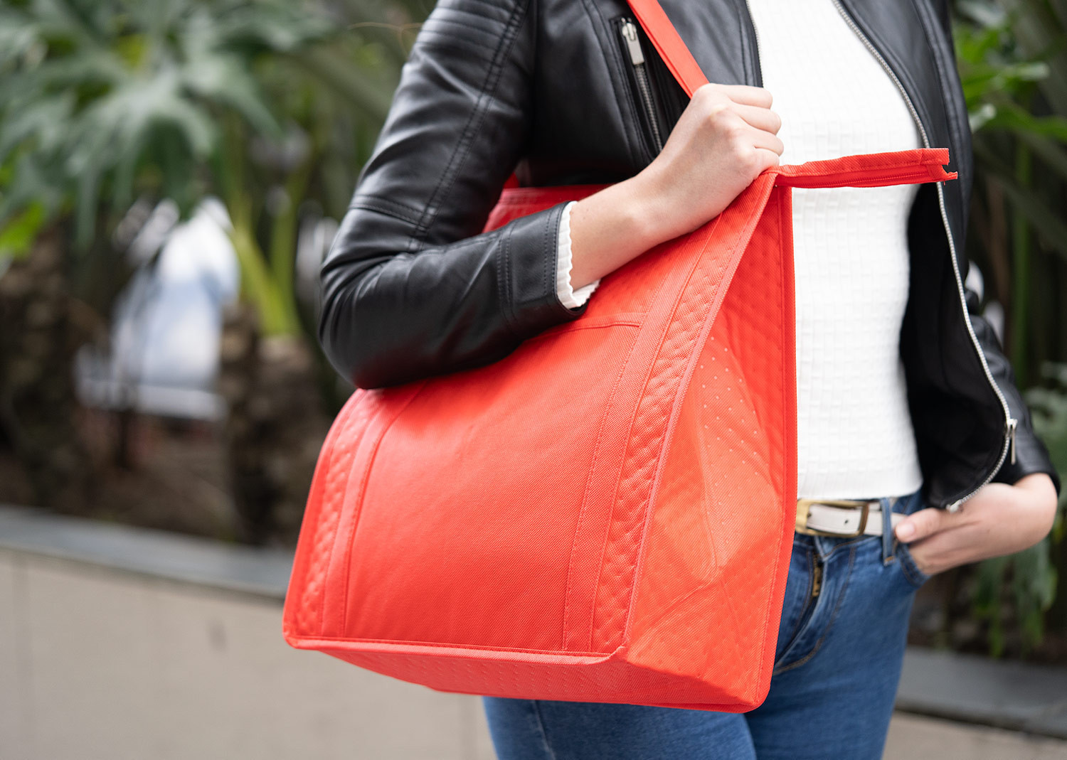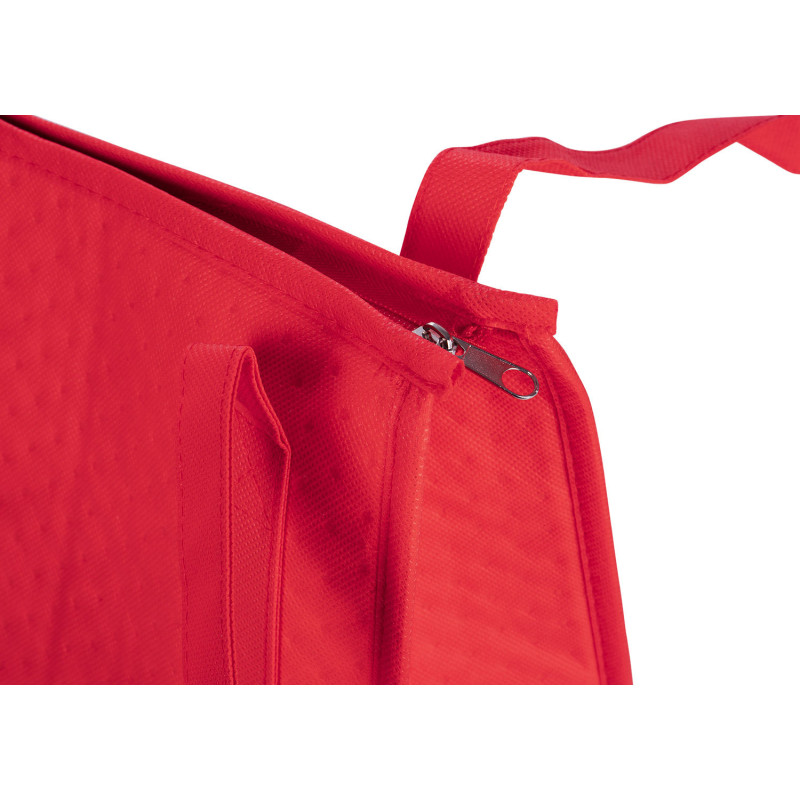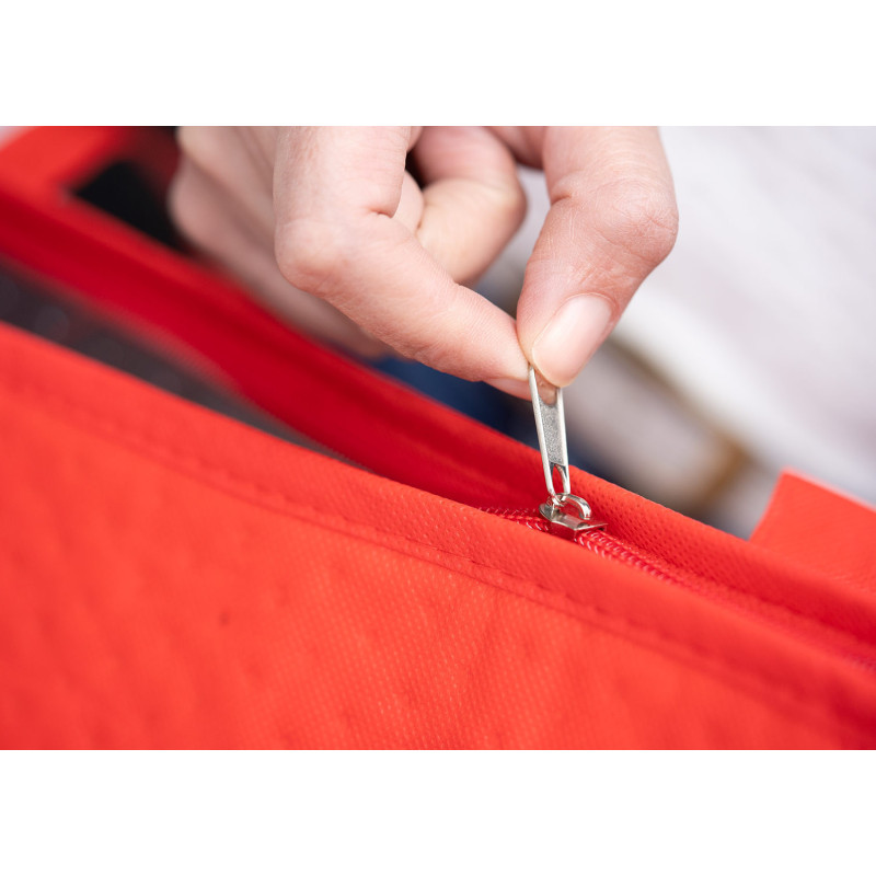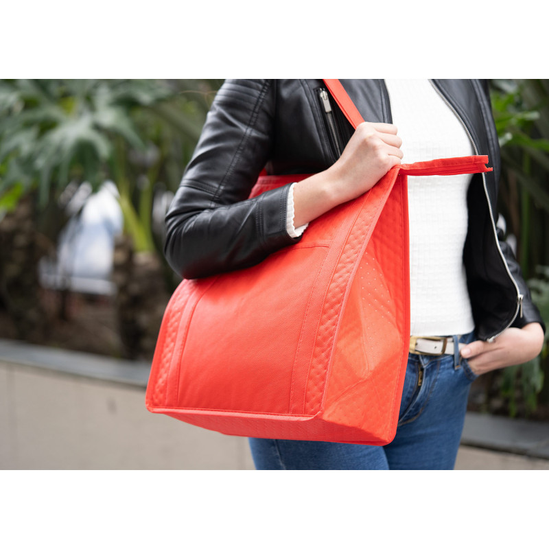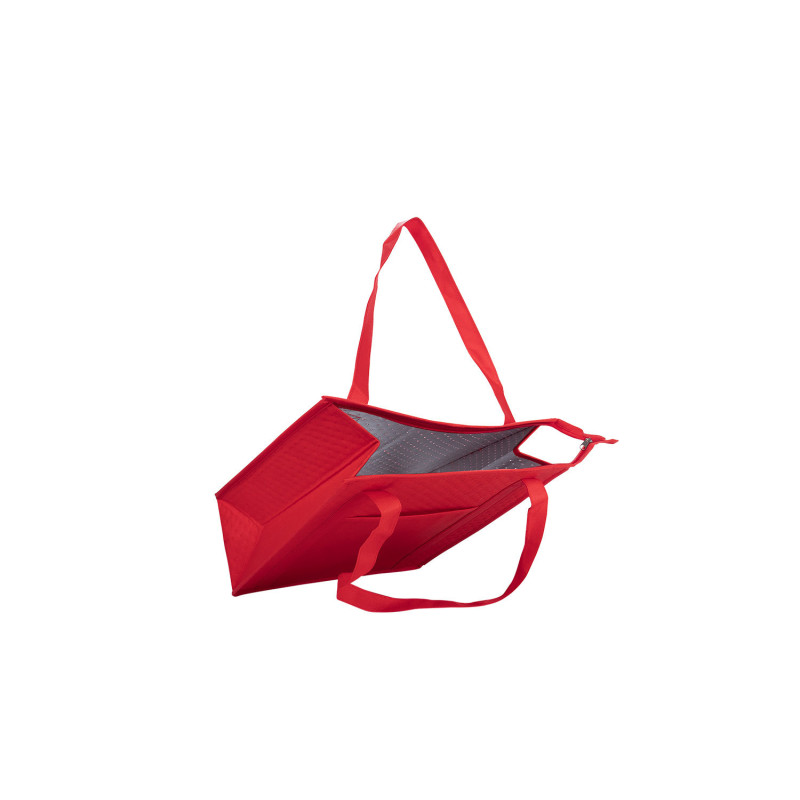 Bolsa de tela reutilizable con recubrimiento interior que ayuda a mantener la temperatura de los productos al interior. Útil para transportar alimentos. Incluye un pequeño bolsillo delantero. Tiene cremallera para cierre y manijas para cargar en tela.