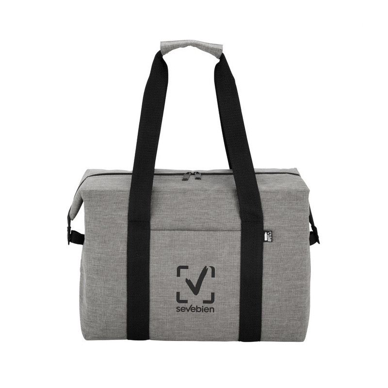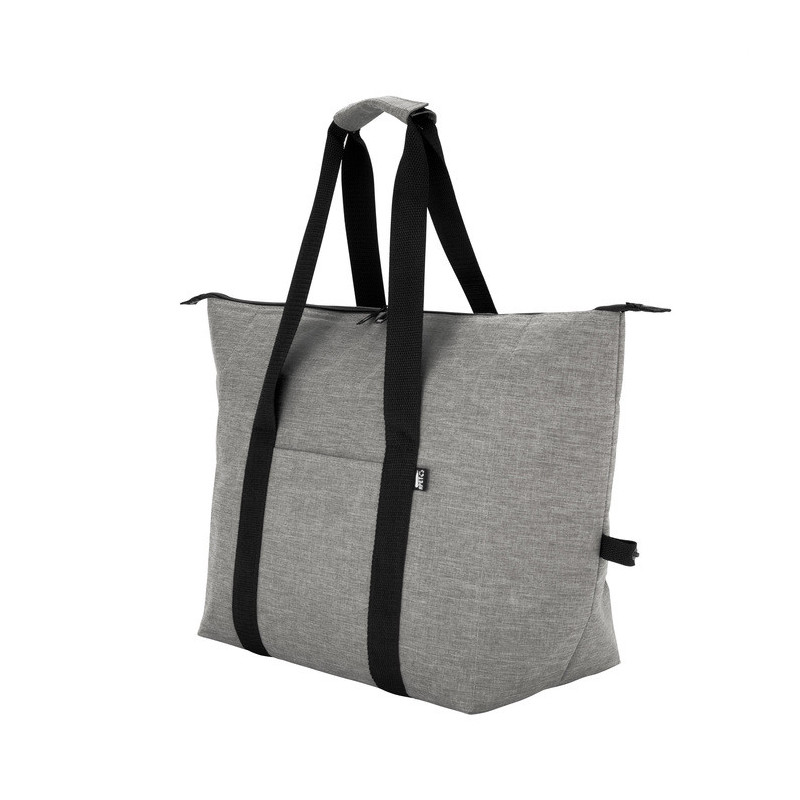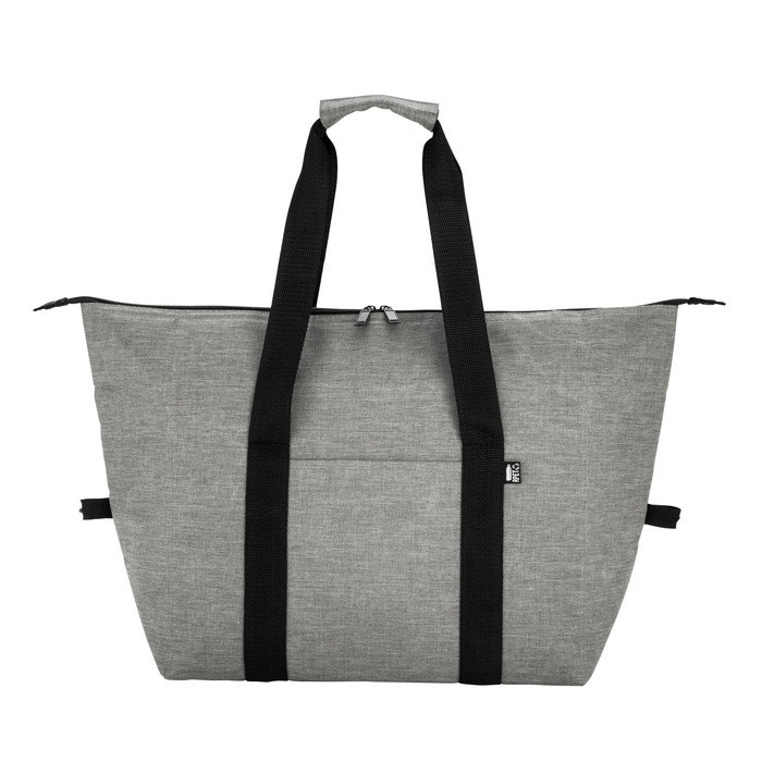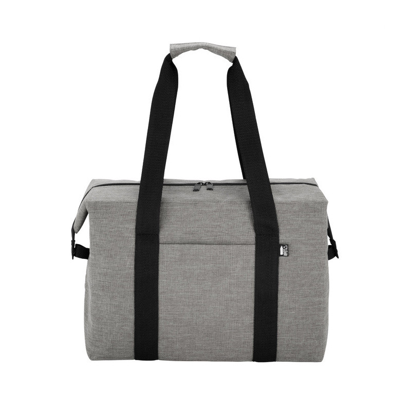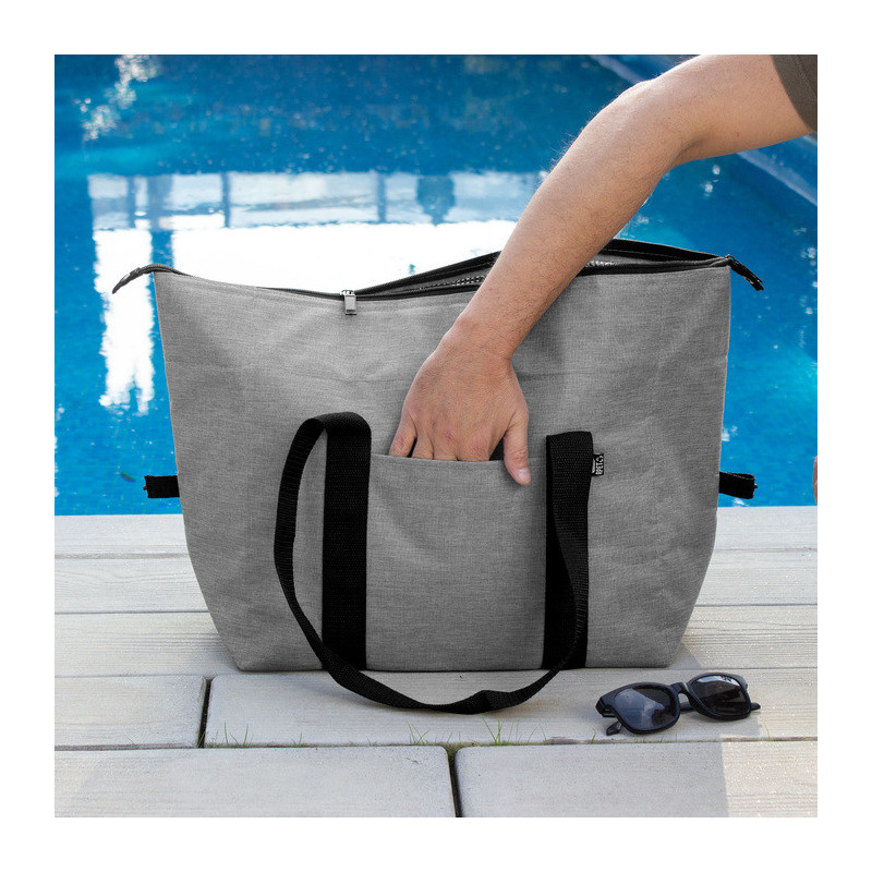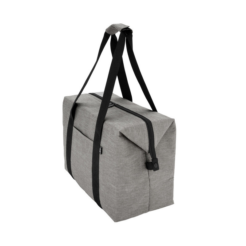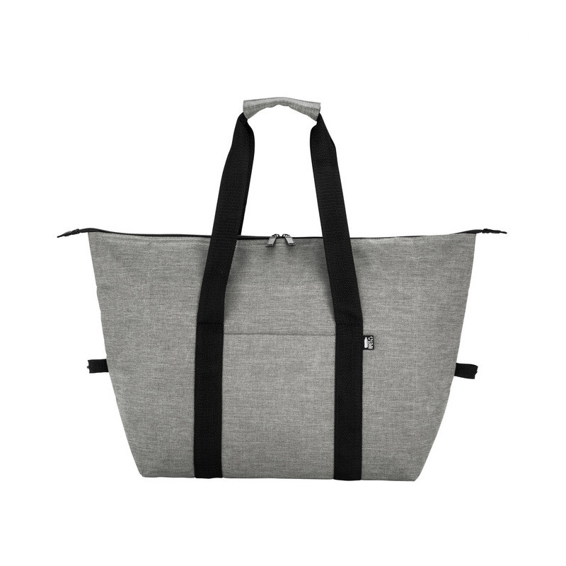 Bolso térmico. Cierre posterior con dos tiradores. Hebillas metálicas en los laterales que permiten cambiar su formato a prisma. Bolsillo frontal. Dos asas con refuerzo de velcro.