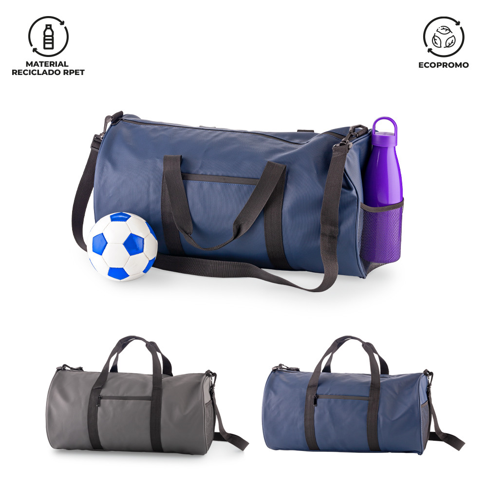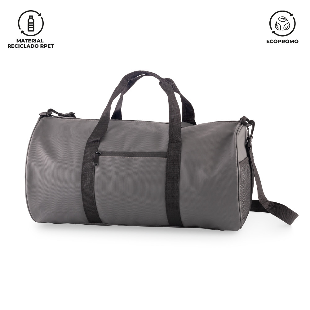 Maletín para viaje en poliuretano reciclado RPET. Un bolsillo frontal con cremallera y un bolsillo lateral de malla. Reata para cargar.