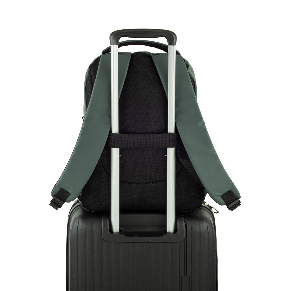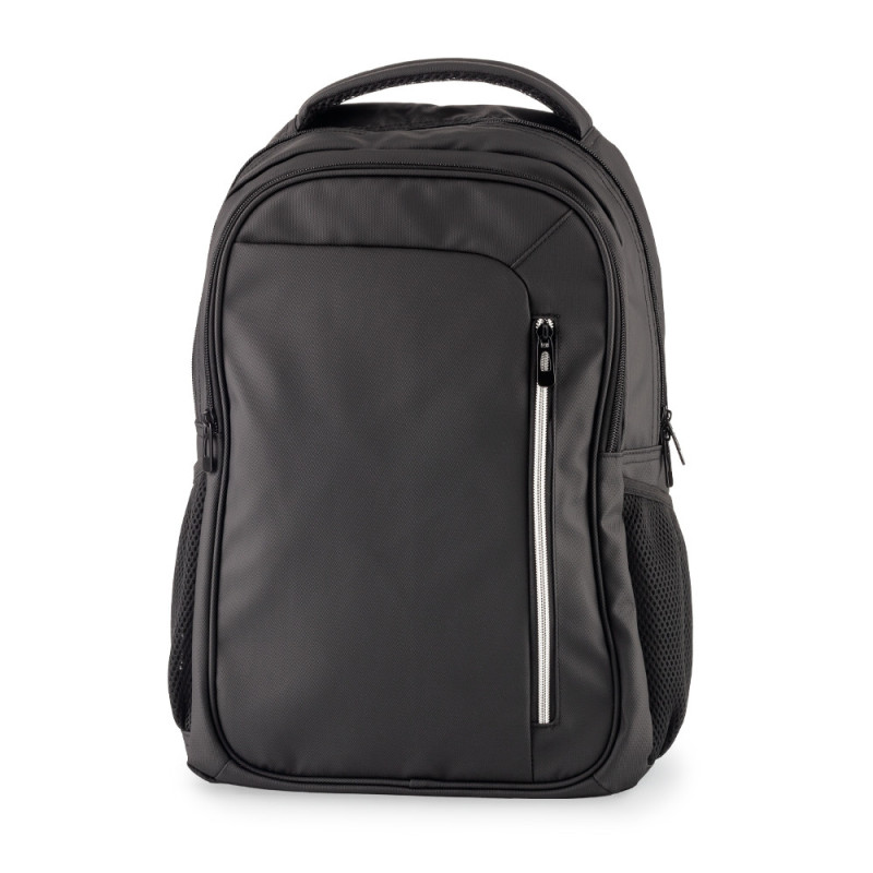 Morral backpack en poliéster. Dos bolsillos laterales con malla y tres bolsillos externos con cremallera. Apto para portátil de 15”. Banda posterior para enganchar en trolley. Espaldar acolchado.