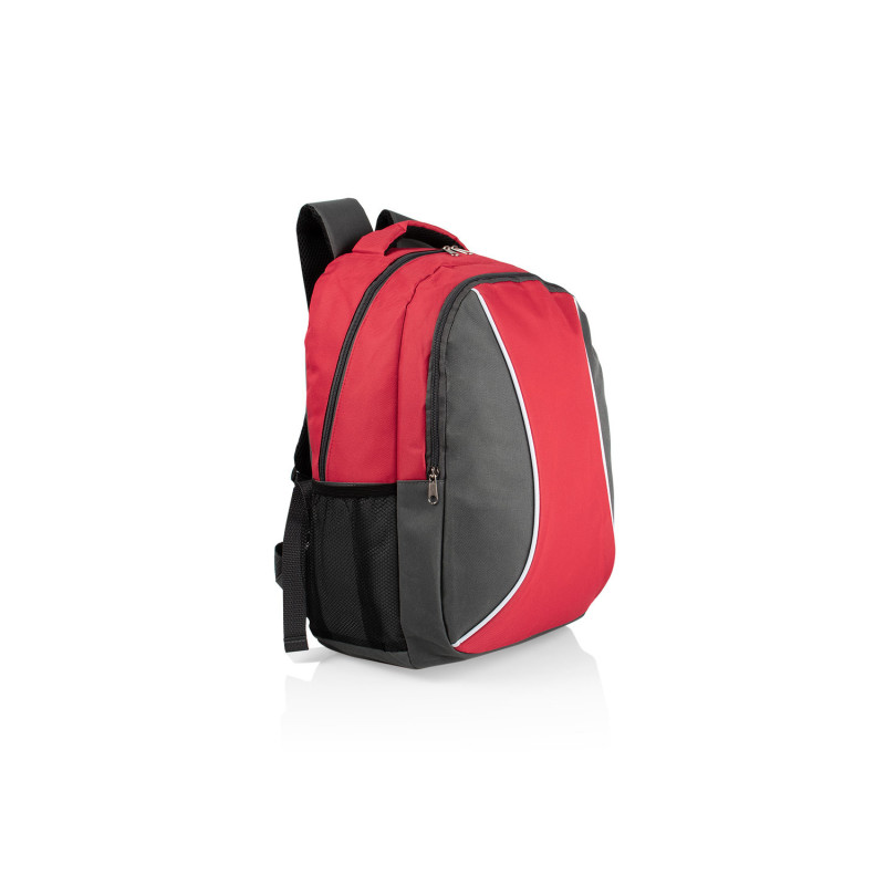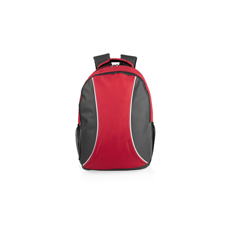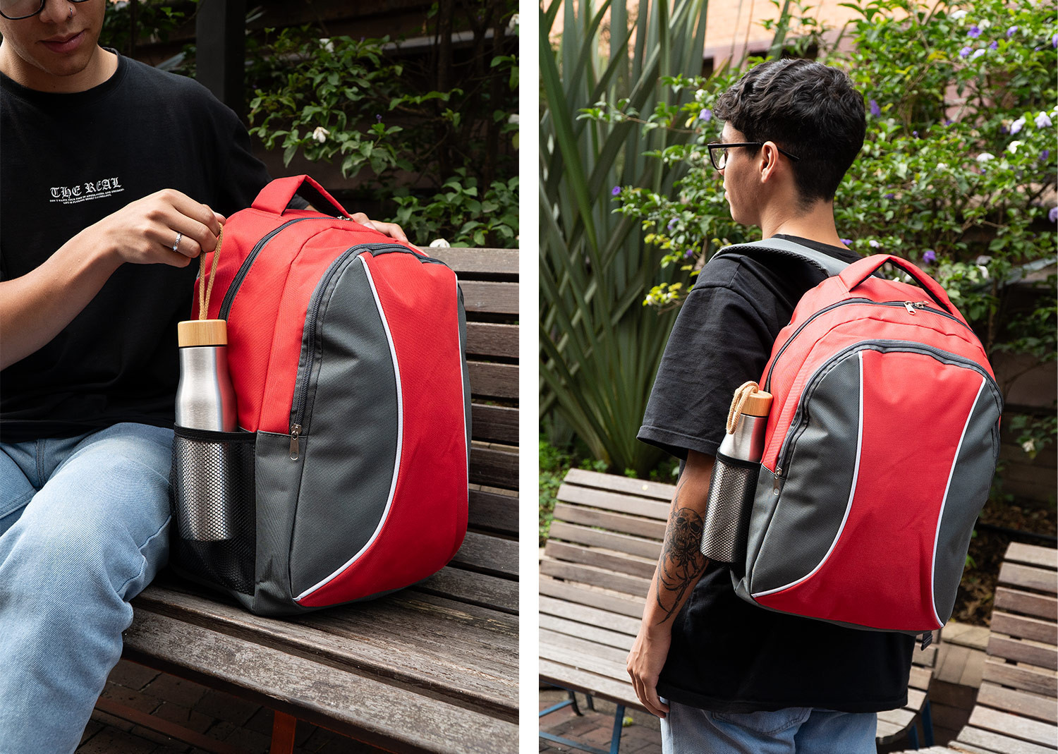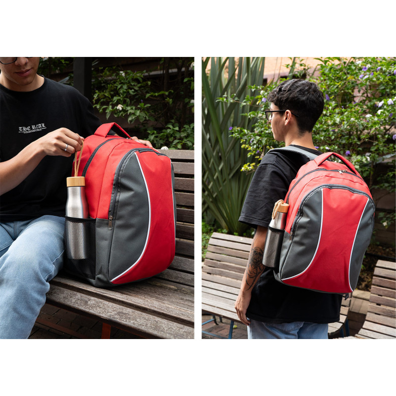 Morral con cargaderas ajustables, bolsillos principal y frontal con cremallera. Bolsillos laterales en malla, útiles para botellas.