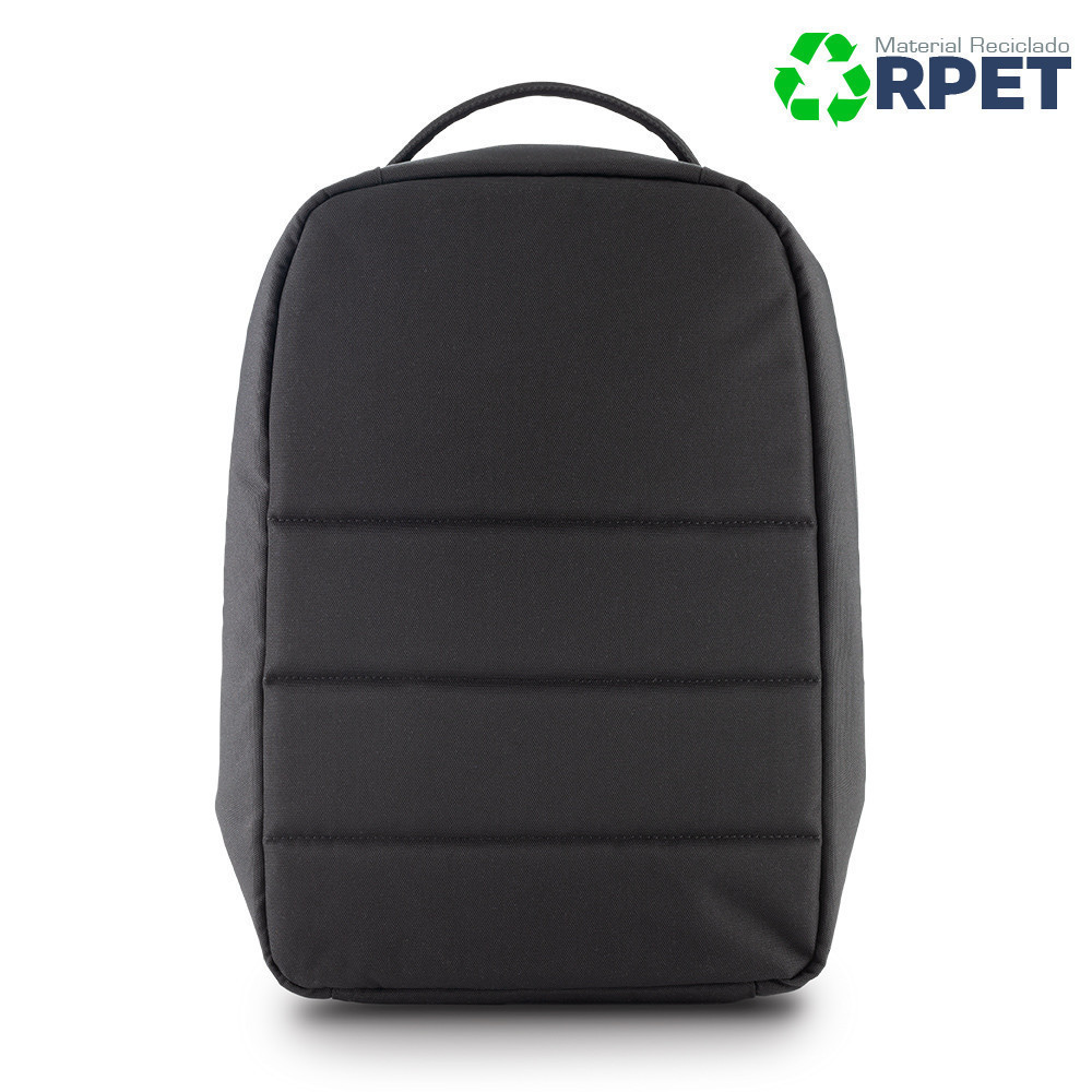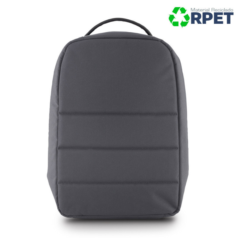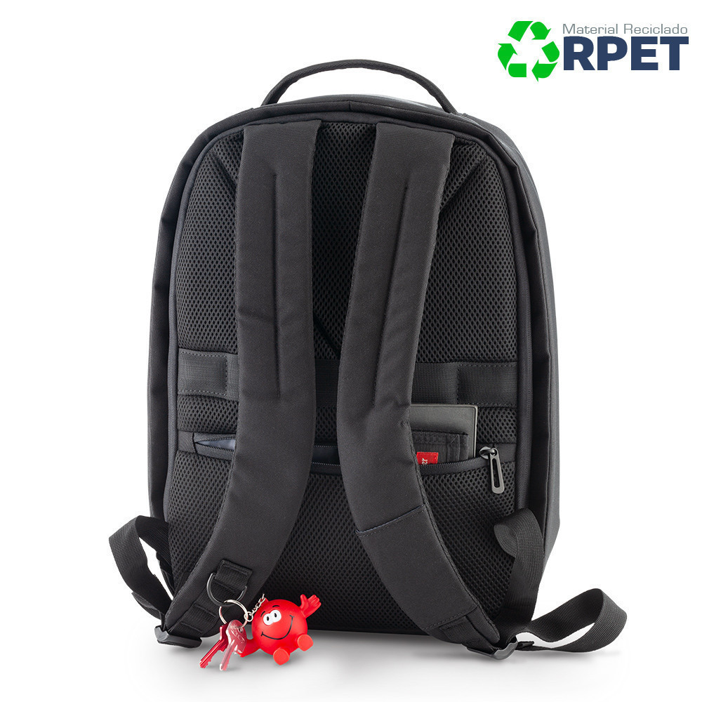 Morral en poliéster reciclado. Cuenta con un espacioso compartimento principal, un compartimento acolchado para ordenador portátil de 15”. Incluye correa para sujetarla a trolley. Bolsillo oculto en el espaldar. Interior y exterior 100% poliéster reciclado.