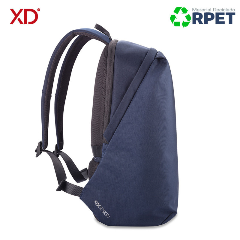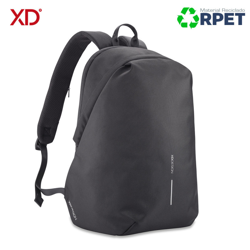 Morral en poliéster reciclado (ahorra 22 litros de agua y se reutilizan 37 botellas de plástico). Bolsillo oculto en el espaldar protegido por RFID, sin acceso frontal y cremalleras ocultas. Cierre de cremallera antirrobo en el compartimento principal, con bolsillo acolchado para ordenador portátil de 15.6", bolsillos inteligentes y un clip para llavero. La parte superior se puede expandir para brindar espacio adicional. Cable USB para conectar pila desde el interior (pila no incluida) y material repelente al agua. Diseño registrado® Empaque caja individual.