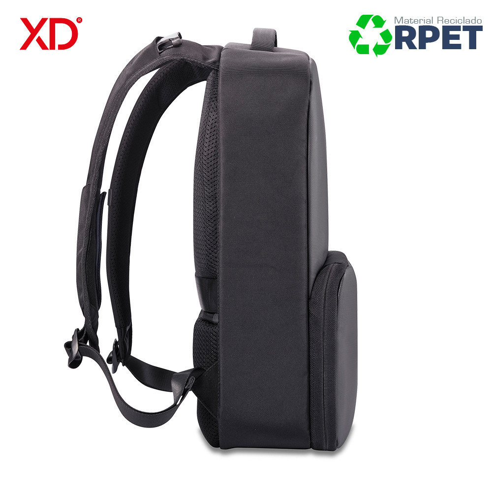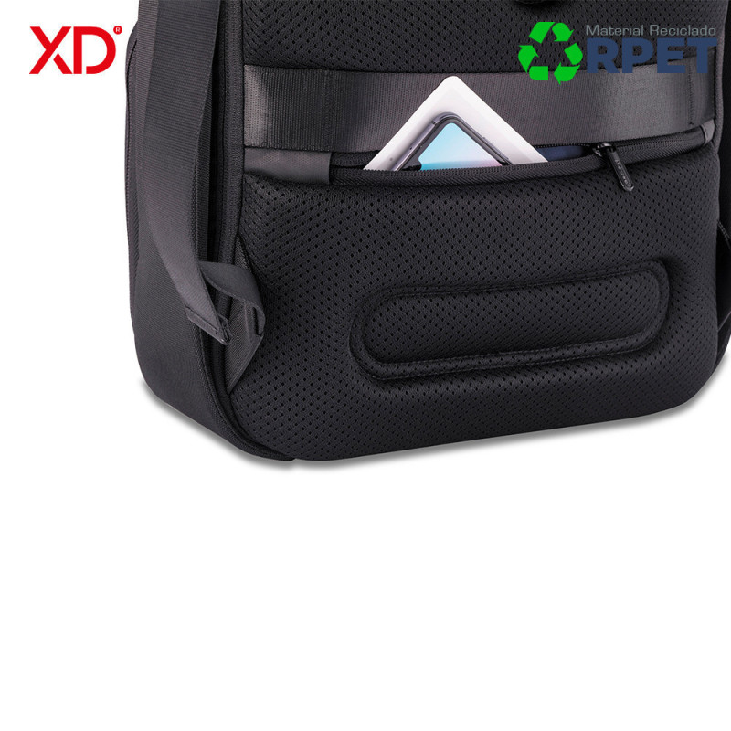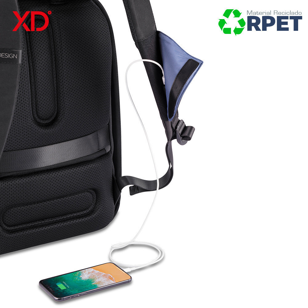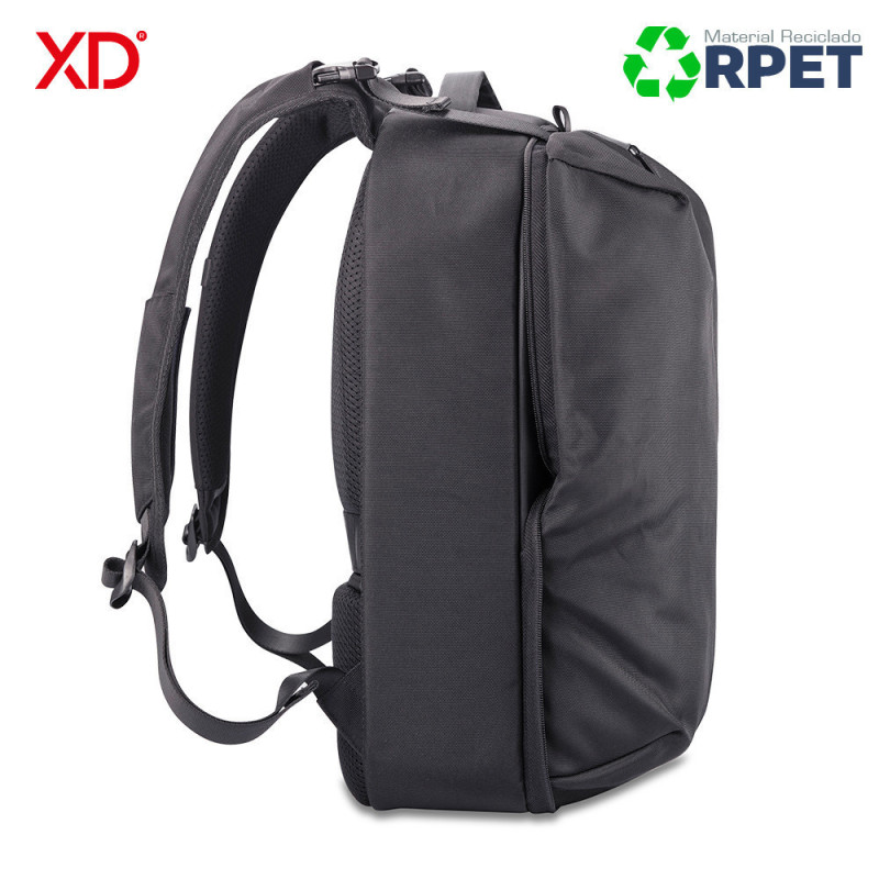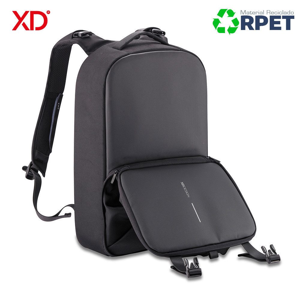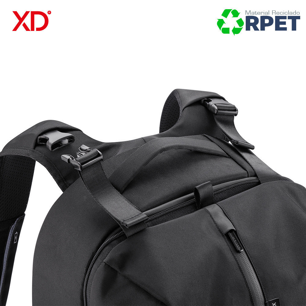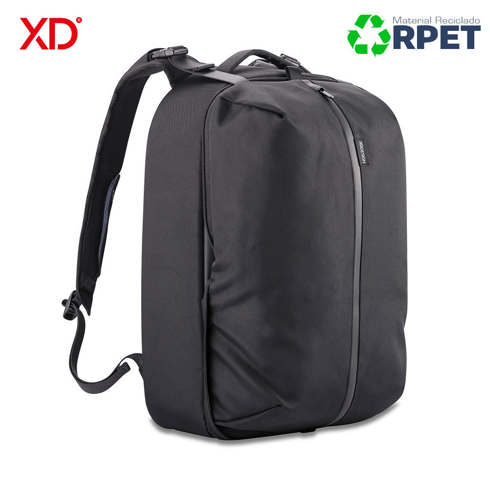 Morral de negocios y deporte al mismo tiempo. Se convierte expandiendo el bolsillo frontal. Diseño antirrobo sin acceso frontal y cremalleras ocultas en el compartimento principal. Bolsillo protegido con RFID en la parte posterior, un puerto de carga USB rápido en la correa (no incluye pila), con un soporte para gafas de sol. Reata posterior para adaptar a trolley. Fabricado con materiales RPET y tecnología AWARE ™, utilizando 53 botellas de agua recicladas y ahorrando 31 litros de agua durante el proceso de producción. Diseño Registrado®.