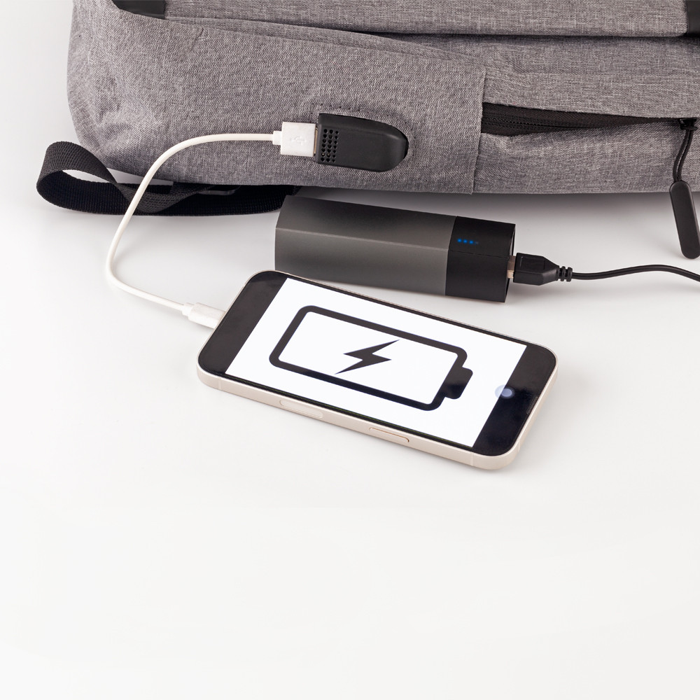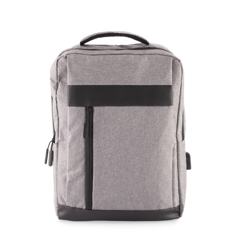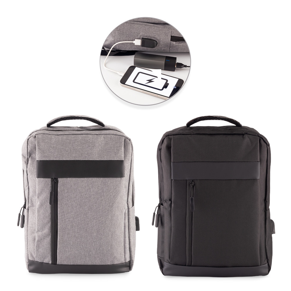 Morral backpack en poliéster, tres bolsillos exteriores con cremallera, capacidad para portátil de hasta 15”y puerto USB para carga desde el interior (no incluye pila). Espaldar acolchado.