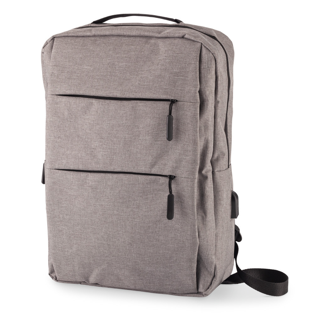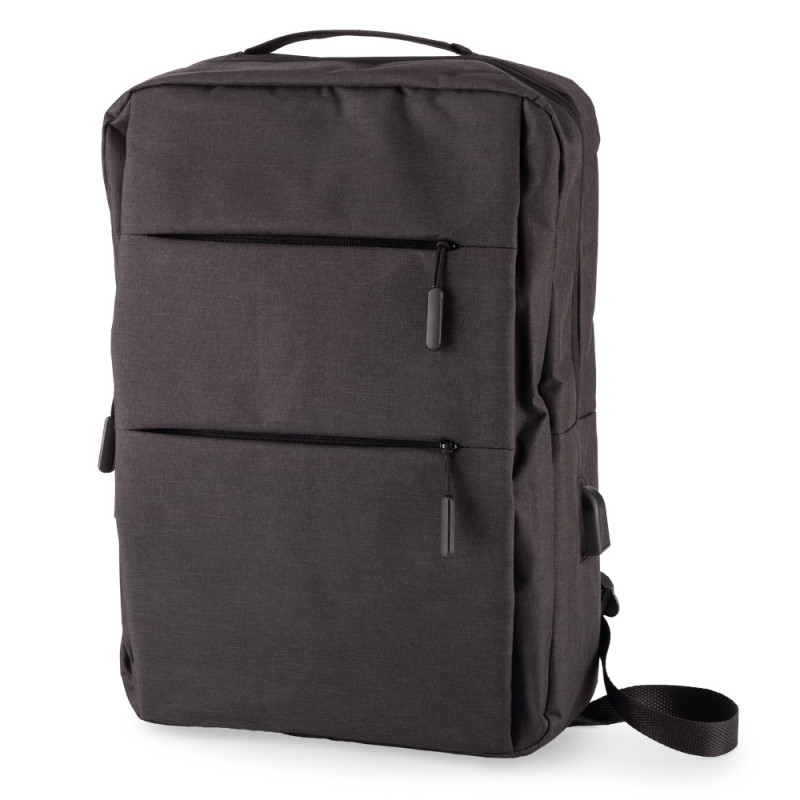 Morral backpack en poliéster. Con cuatro bolsillos externos con cremallera. Apto para portátil de 15”. Puerto USB para cargar desde el interior (no incluye pila). Espaldar acolchado.