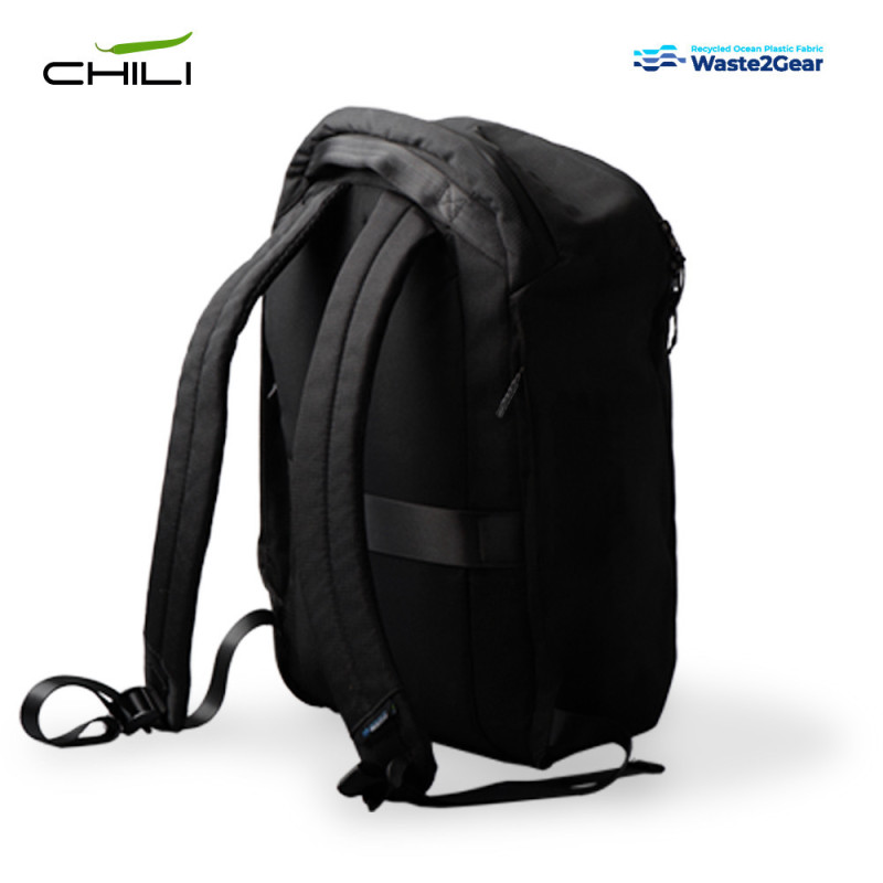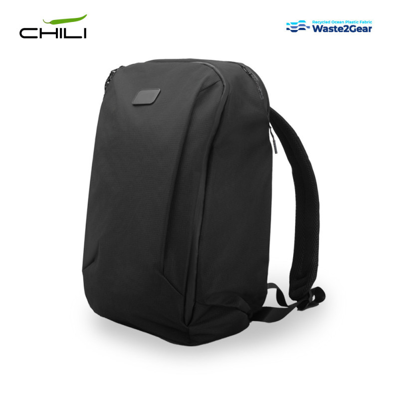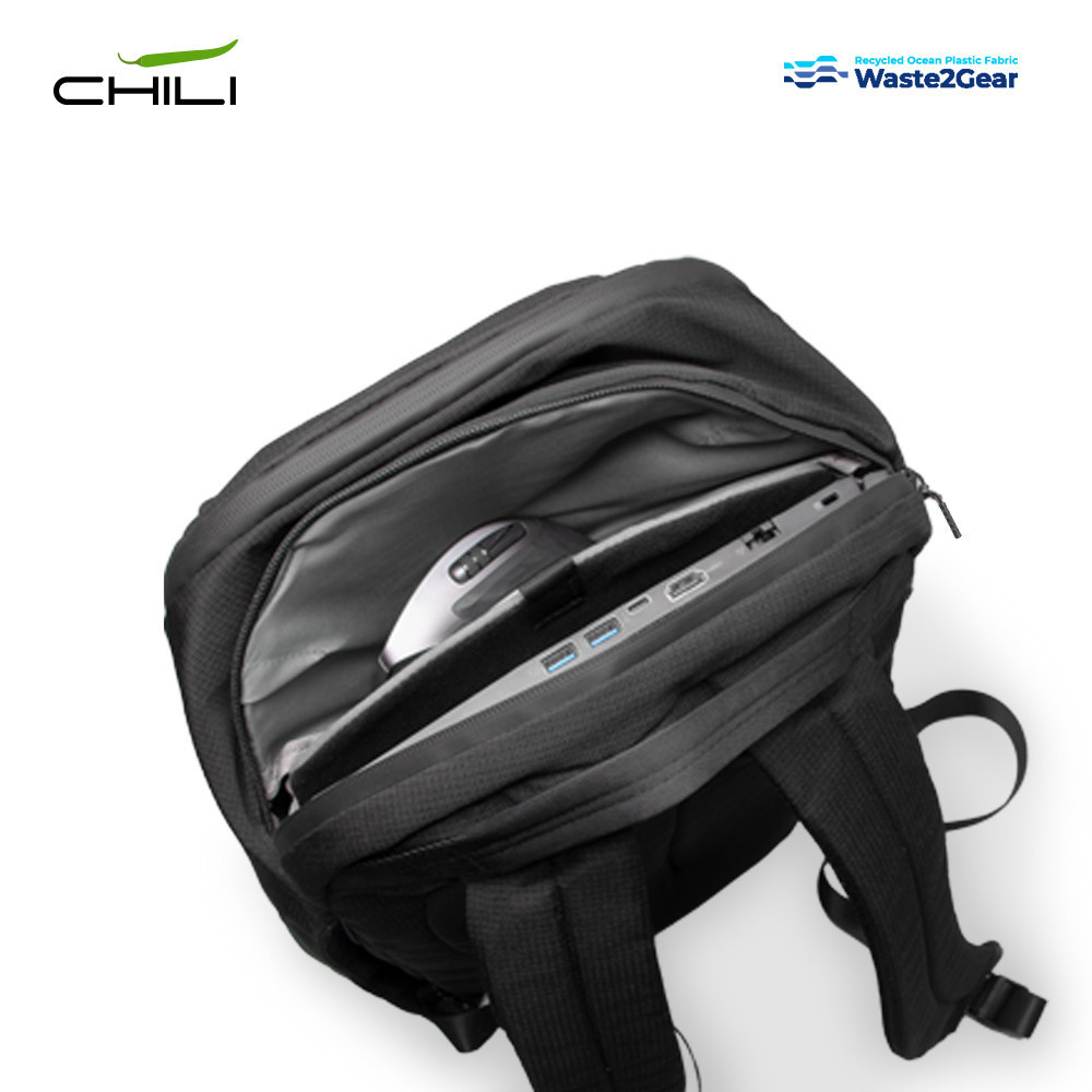 Morral elaborado con poliéster tejido de plástico marítimo reciclado. Seis compartimentos con cierre de cremallera. Incluye placa metálica para marcar.