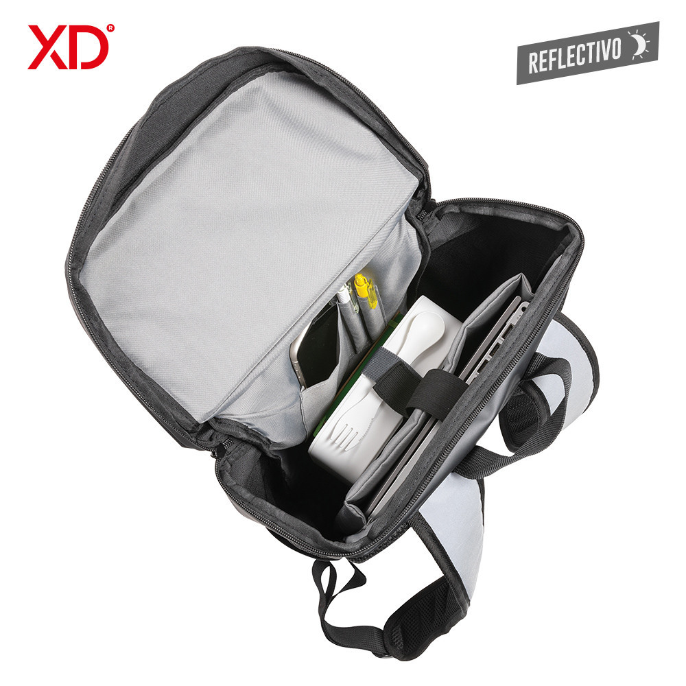 Morral en poliéster y poliuretano, compartimento principal con bolsillo para portátil de 15,6” y un bolsillo pequeño para teléfono o llaves. Dos bolsillos frontales, dos mallas laterales y espaldar acolchado. Piezas reflectivas de gran tamaño en la parte frontal y cargaderas para aumentar la visibilidad. Resistente al agua (no sumergible).