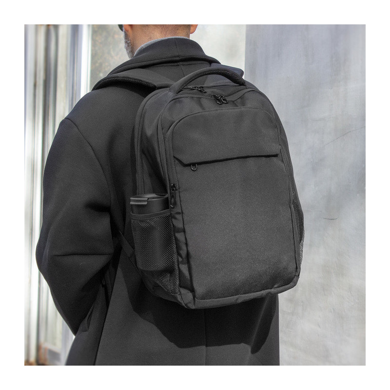Capacidad 20 litros aprox. Poliéster Gucci 1200D. Interior en poliéster 210D estampado. Morral portanotebook de hasta 16 pulgadas. 3 compartimentos con cierre. Compartimento posterior con bolsillo acolchado porta notebook. Amplio compartimento central. Compartimento frontal, interior con bolsillos organizadores y 1 bolsillo frontal con cierre horizontal oculto. 2 Bolsillos laterales de red elastizados porta botellas y accesorios. Asa superior reforzada, correas ajustables y espalda acolchadas. Tira para sujetar la mochila en la manija extensible de un equipaje de mano. Cierres y tiradores de cierres metálicos.