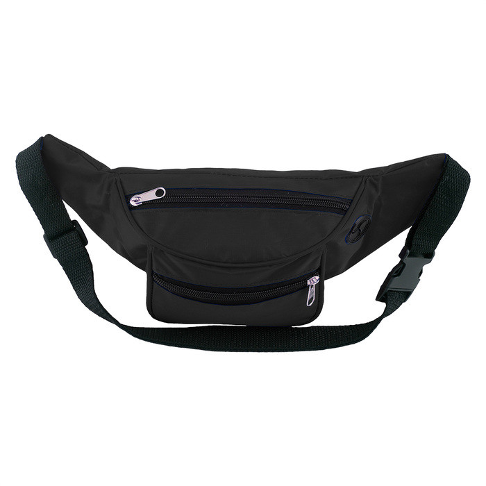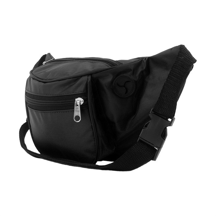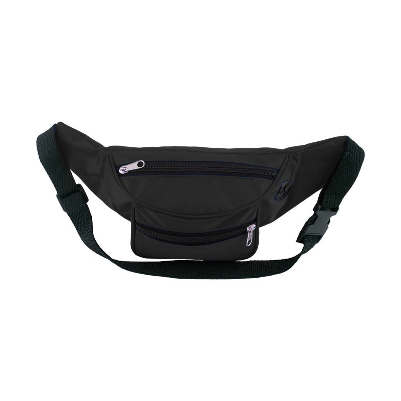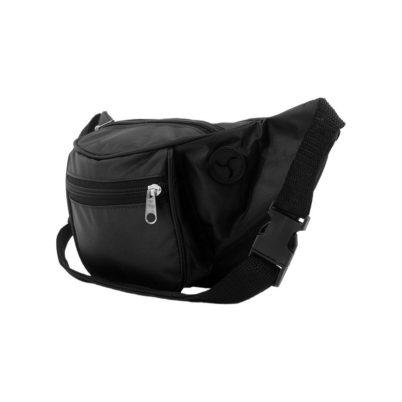En poliéster 420D, 2 bolsillos, salida para auriculares, correa ajustable y herrajes plásticos.