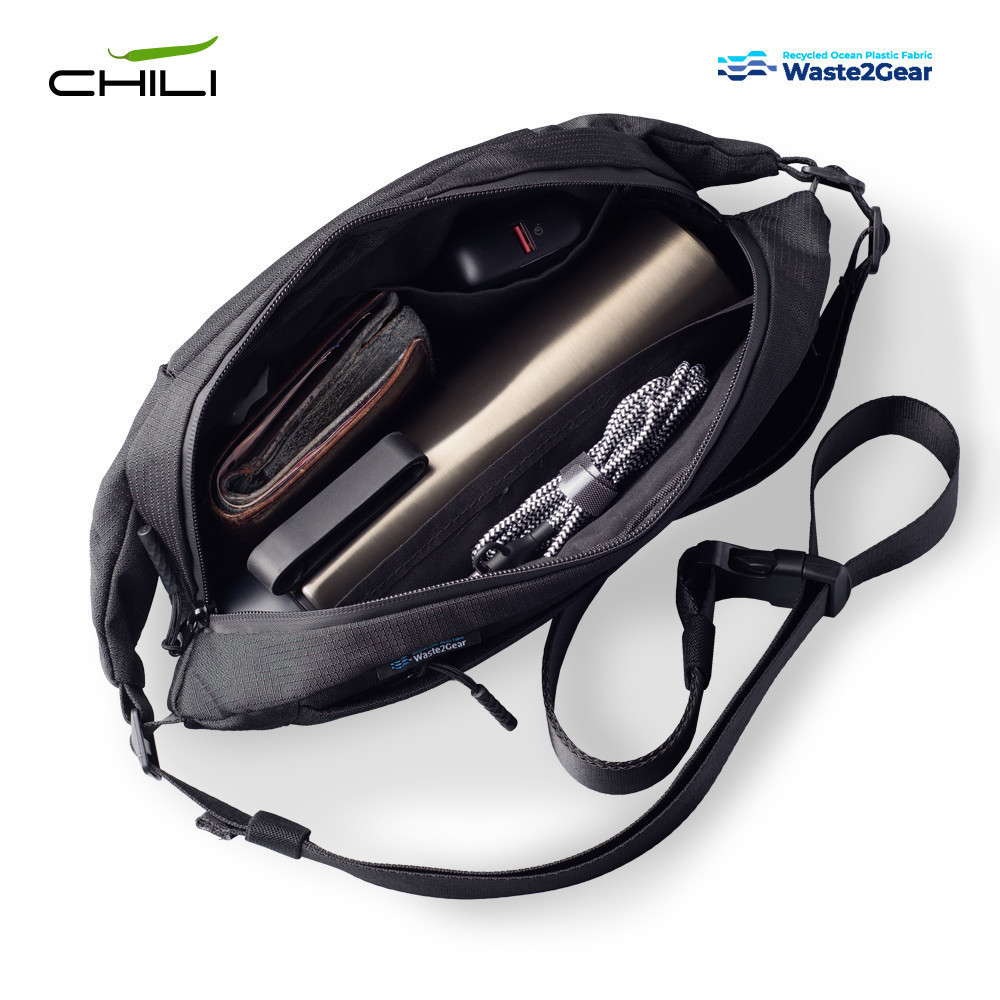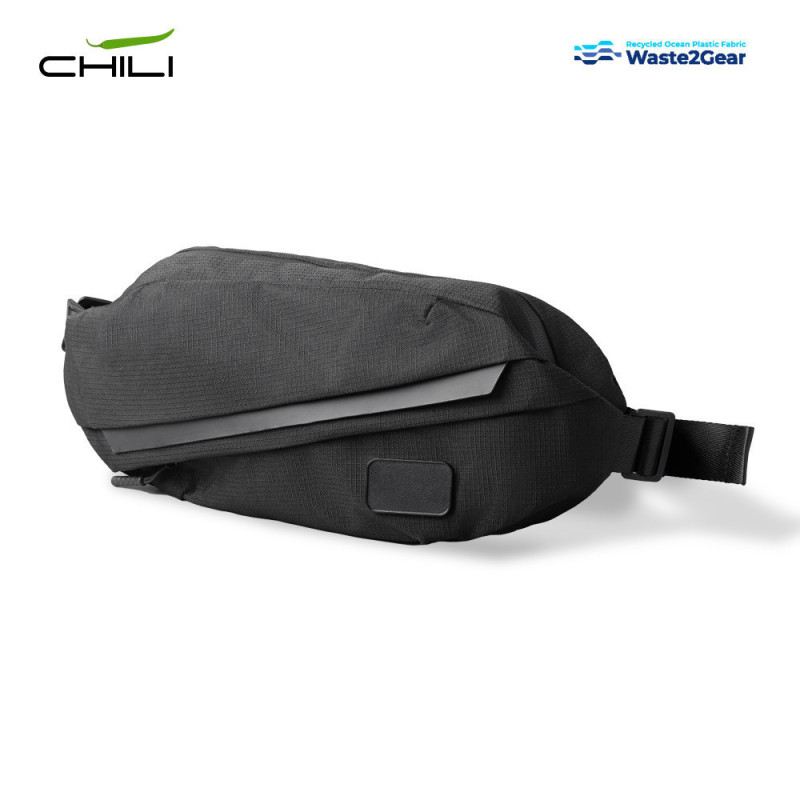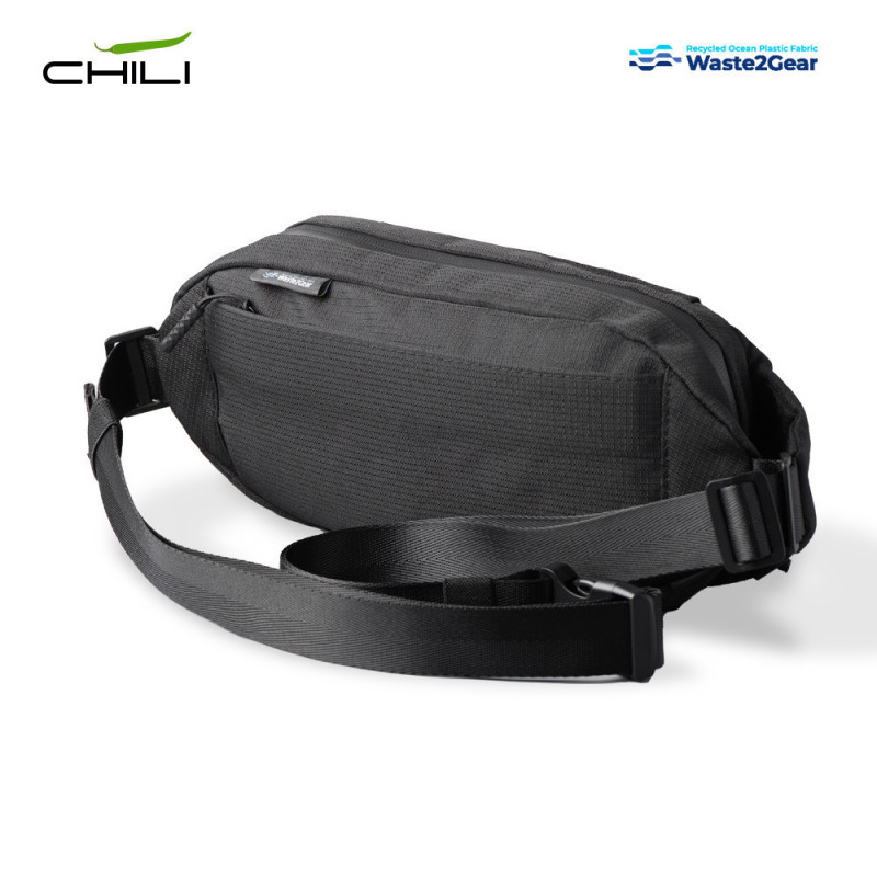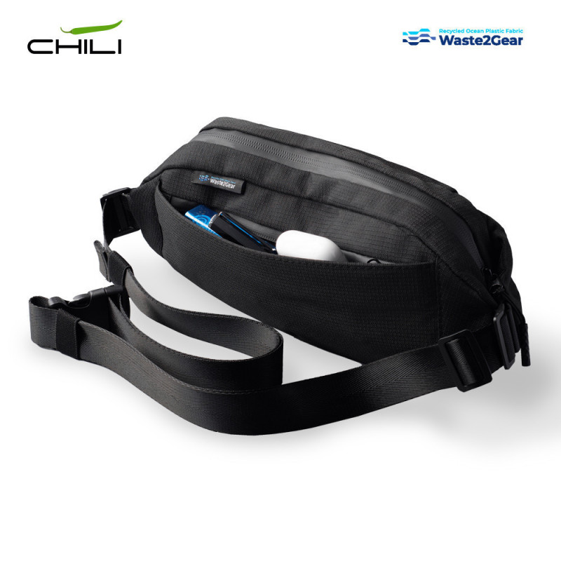 Canguro elaborado con poliéster tejido de plástico marítimo reciclado. Tres compartimentos con cierre de cremallera. Incluye placa metálica para marcar.