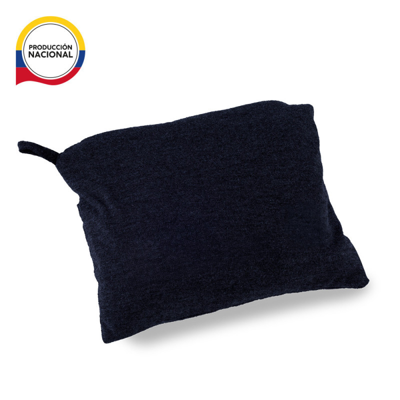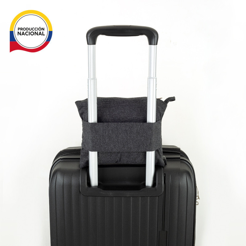 Cobija en poliéster licra. Puede ser usada de dos maneras: de cobija si se abre y de almohada cuando se compacta y se cierra. Bolsa en poliéster con correa para sujetarla a trolley.