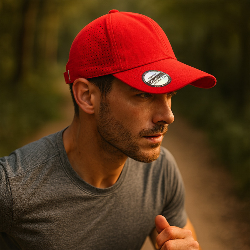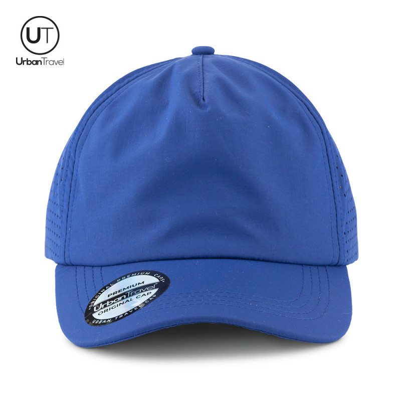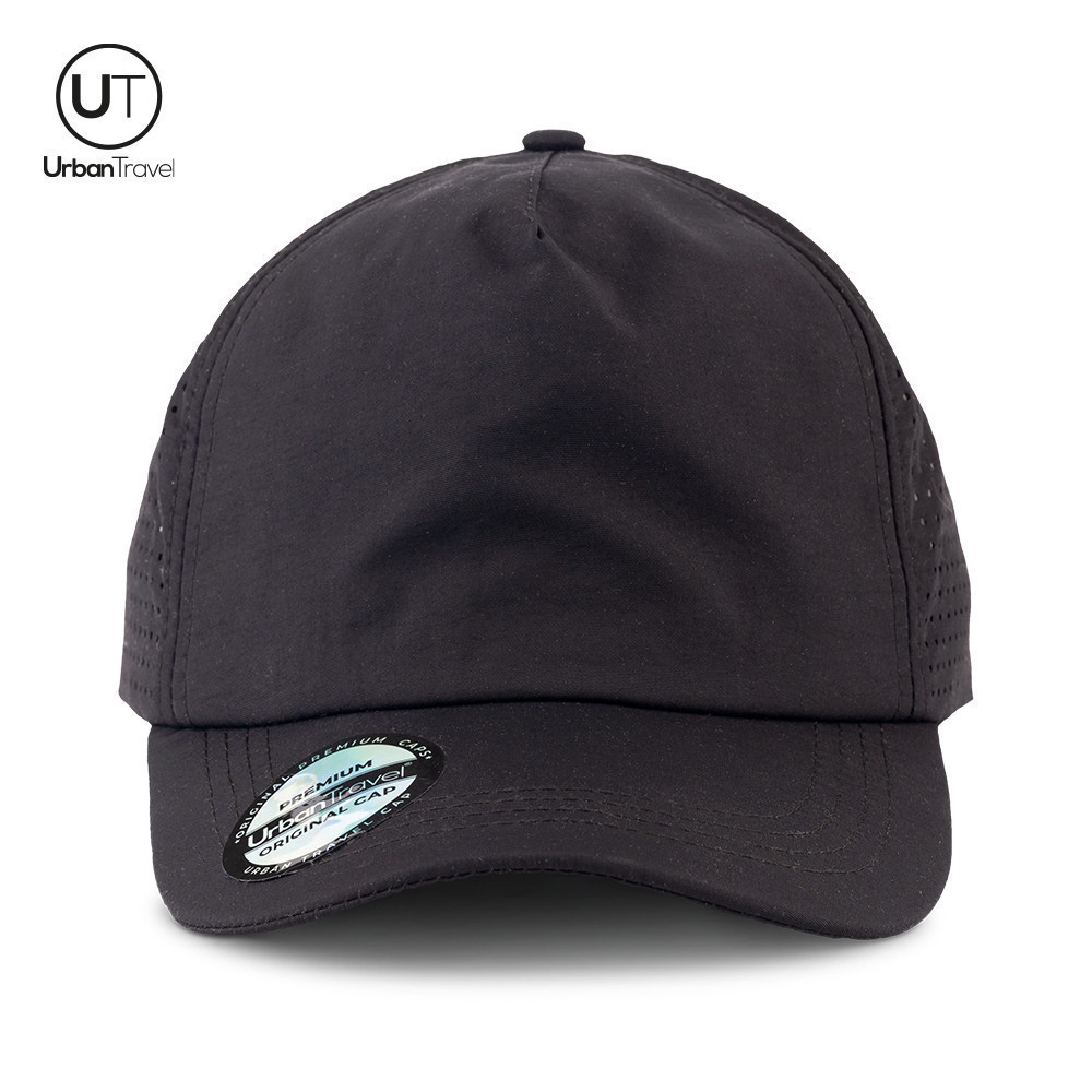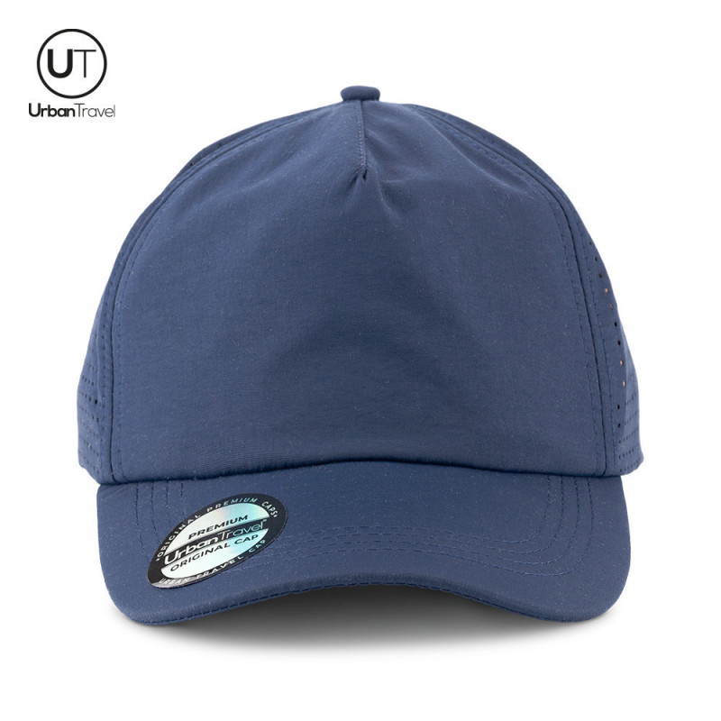 Gorra deportiva en nylon de 5 páneles con 4 hojaletes y cierre de hebilla metálica.