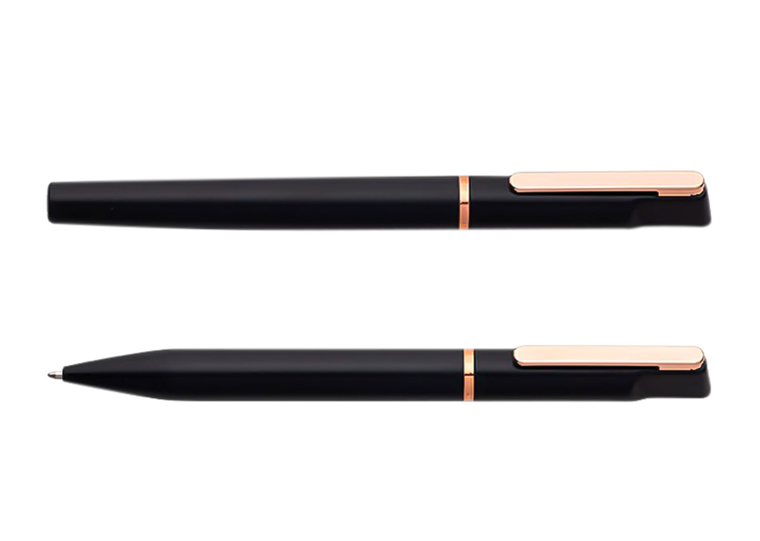 Set de escritura elaborado en aluminio reciclado, compuesto por bolígrafo con mecanismo giratorio (twist) y bolígrafo roller con tapa. Presentación en estuche rígido con detalles metálicos. Diseño elegante, funcional y de líneas clásicas.