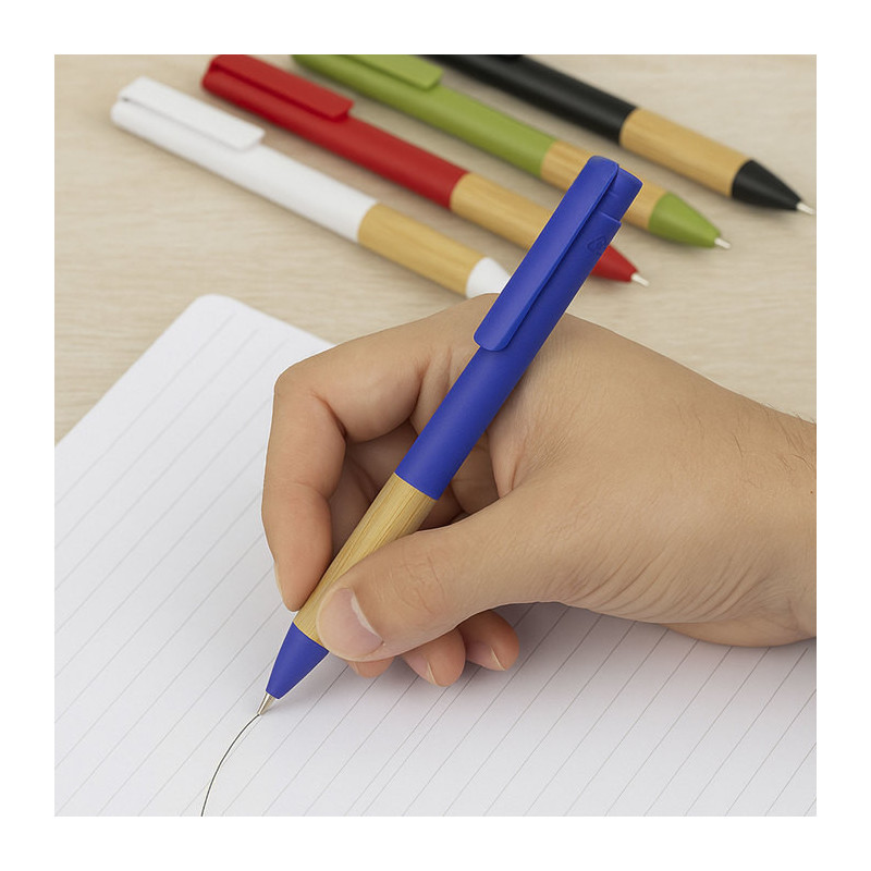 Bolígrafo retráctil. Cuerpo, puntera y pulsador de plástico reciclable. Agarre de bambú. Pintura acabado mate.