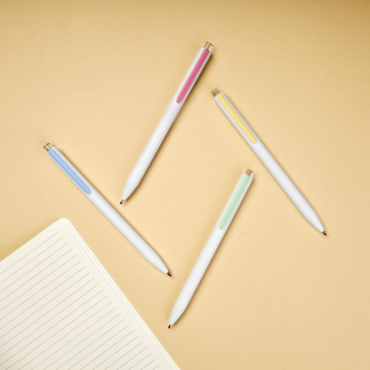 Bolígrafo con tinta semigel. Clip simulado que añade un toque de color moderno. Mecanismo pulsador.