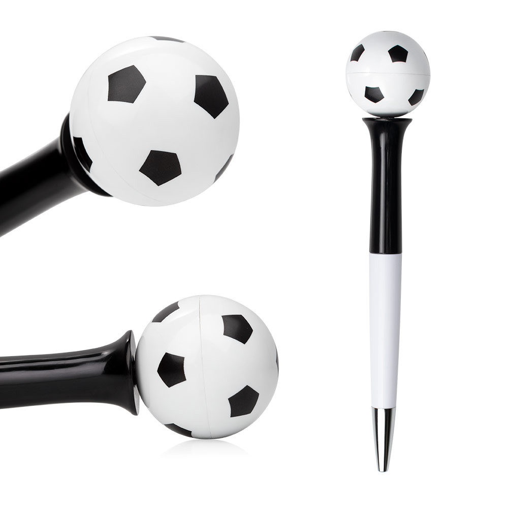 Bolígrafo de acción giratoria con barril de color sólido y punta cromada, ideal para los amantes del fútbol. Su diseño incluye una esfera decorativa con impresión de balón en la parte superior, que gira suavemente para añadir un toque divertido y dinámico mientras escribes.