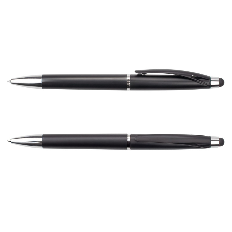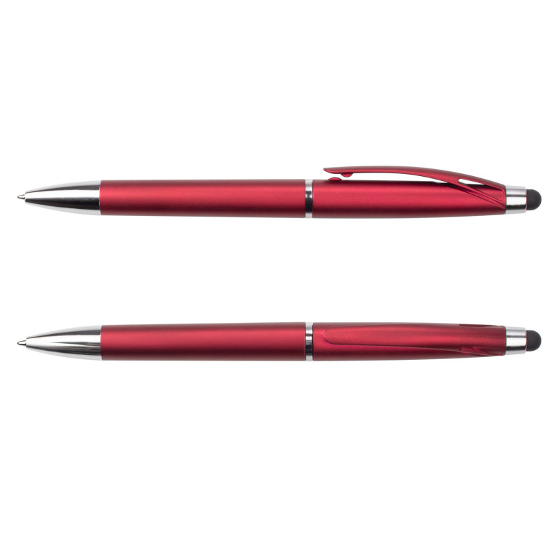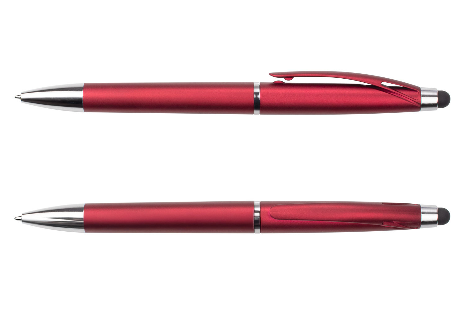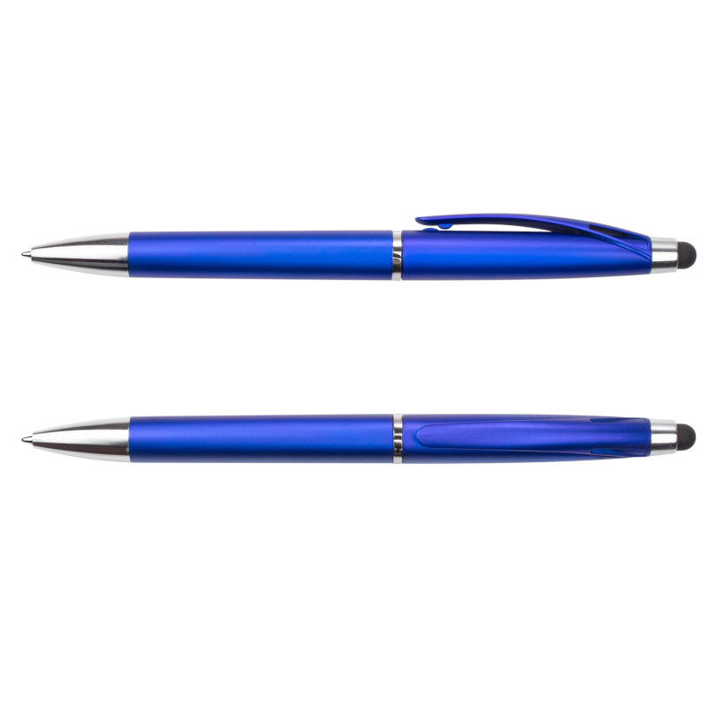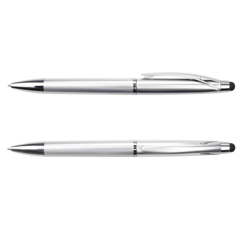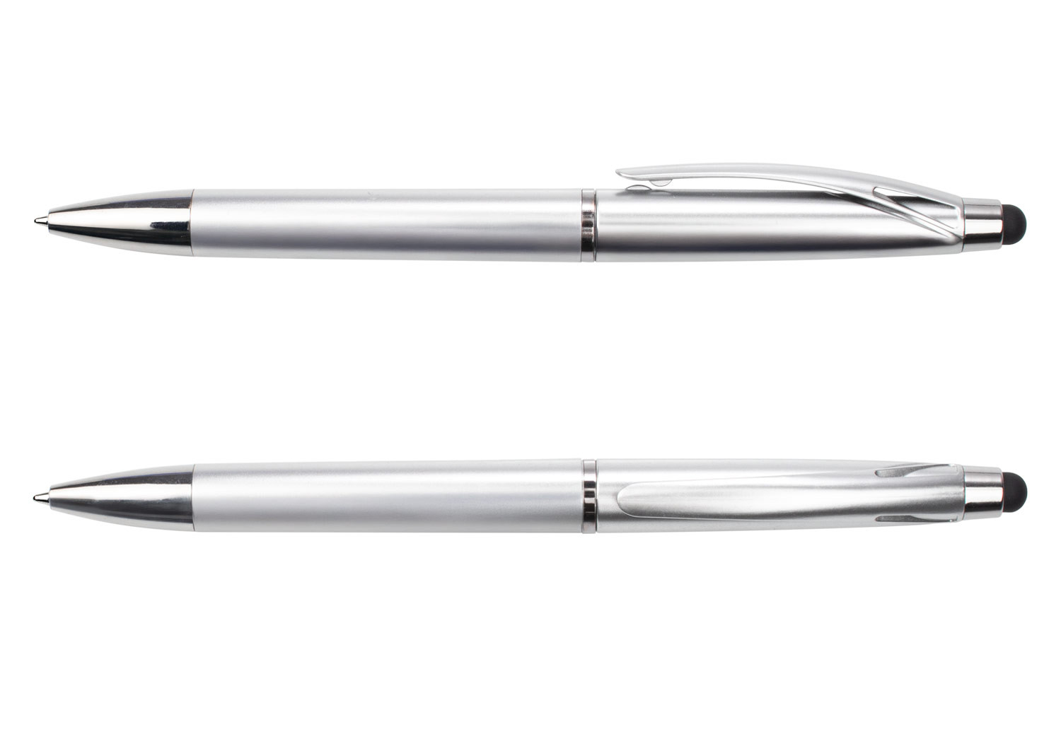 Bolígrafo elegante con barril de color metálico. Presenta adornos cromados que aportan un acabado sofisticado. En la parte superior incluye un lápiz táctil negro compatible con dispositivos móviles. El mecanismo de escritura es giratorio, lo que permite extender la punta con un giro sencillo.