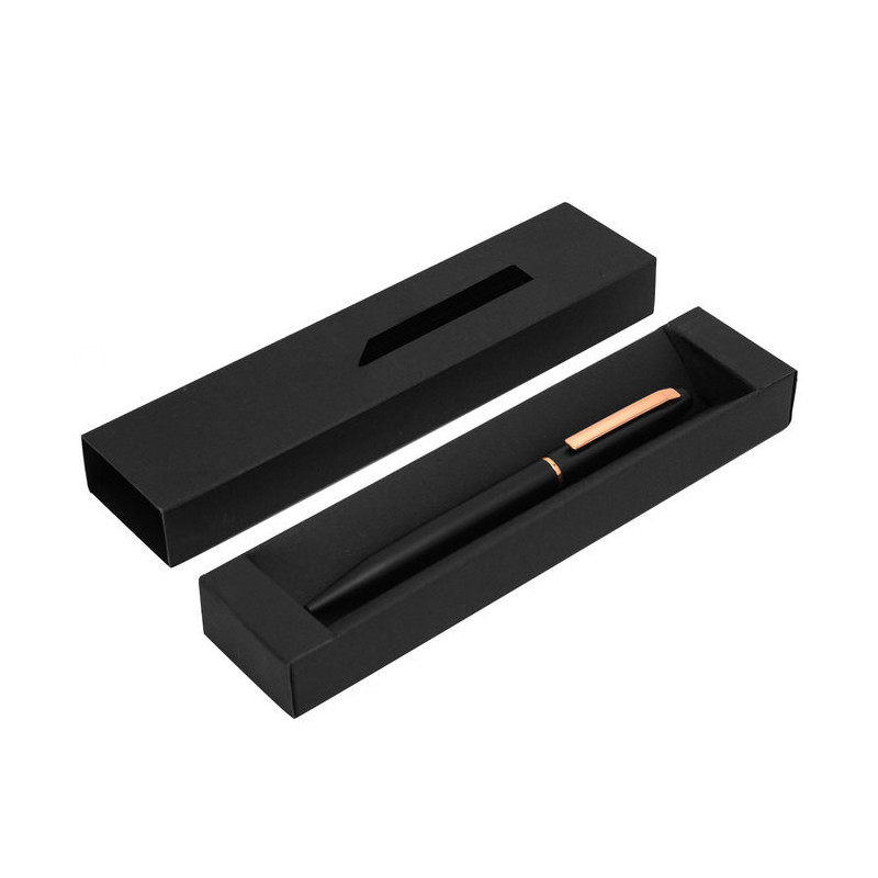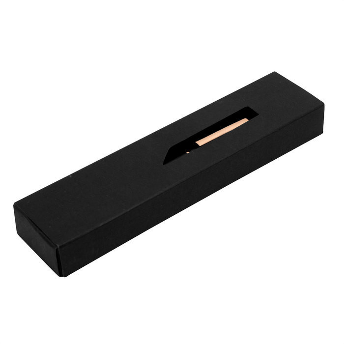 Diseño elegante para quienes valoran calidad y sostenibilidad. Bolígrafo con apertura giratoria. Cuerpo metálico en negro mate. Cuerpo de aluminio reciclado. Destape electroplateado en gold rose en la parte superior. Recarga metálica. Clip y anillos metálicos color gold rose.