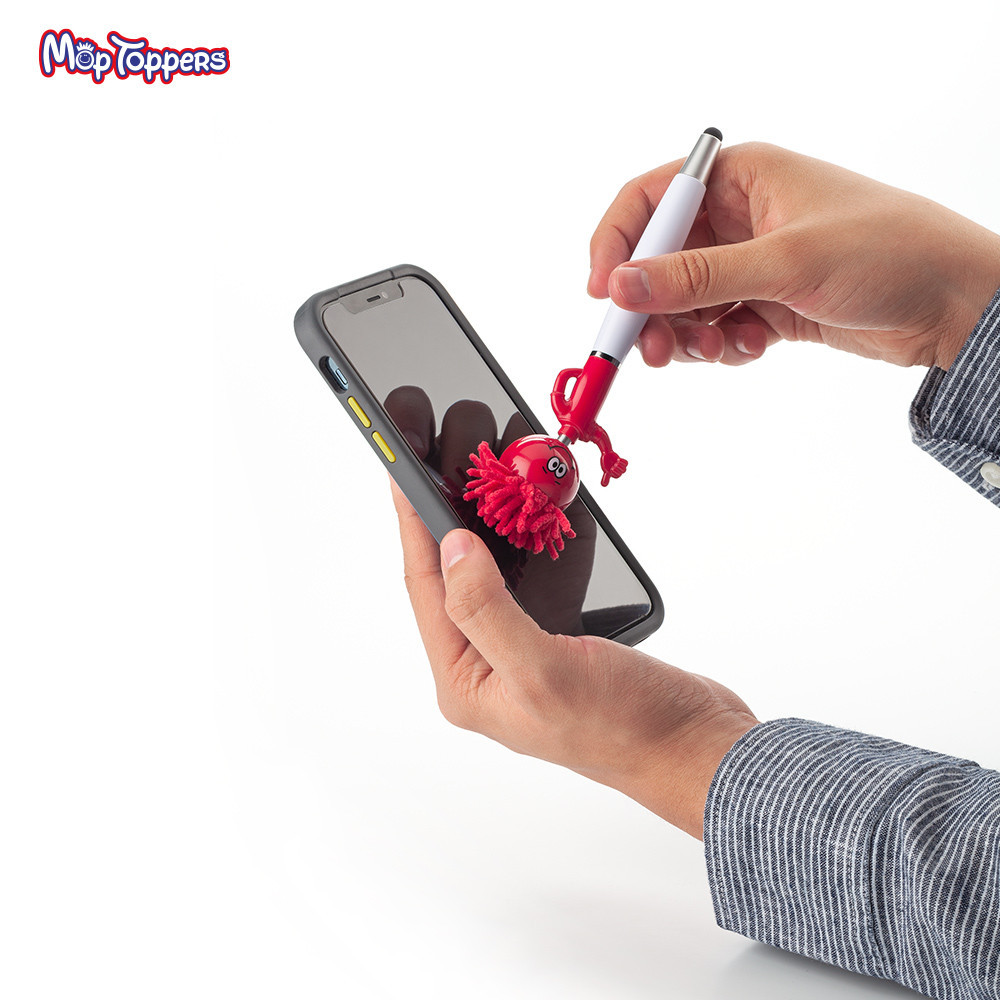 Bolígrafo plástico con stylus y cabeza con microfibra para limpiar pantallas. Mecanismo push.