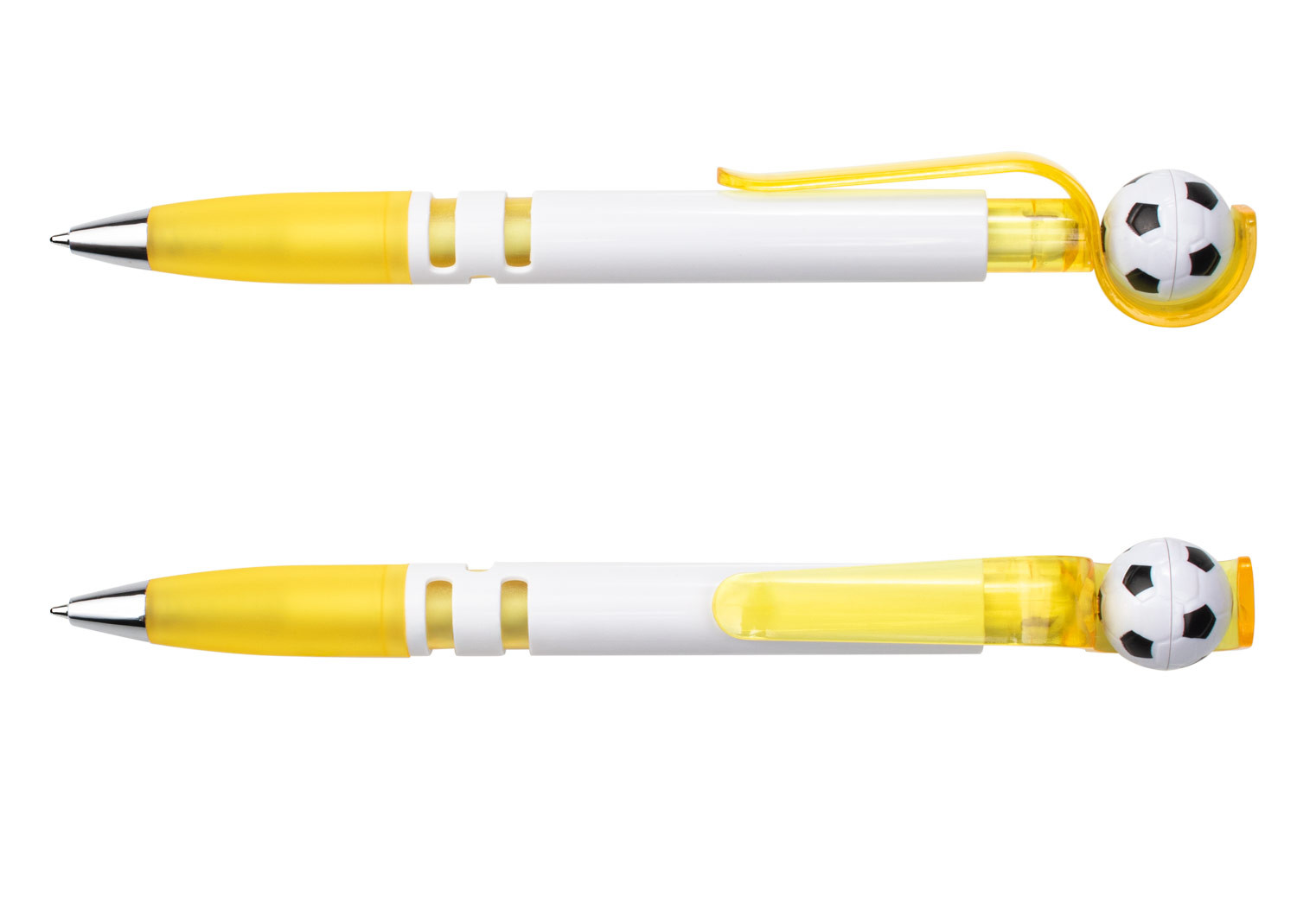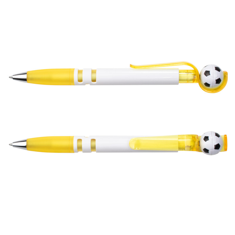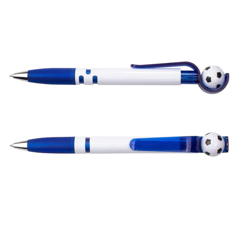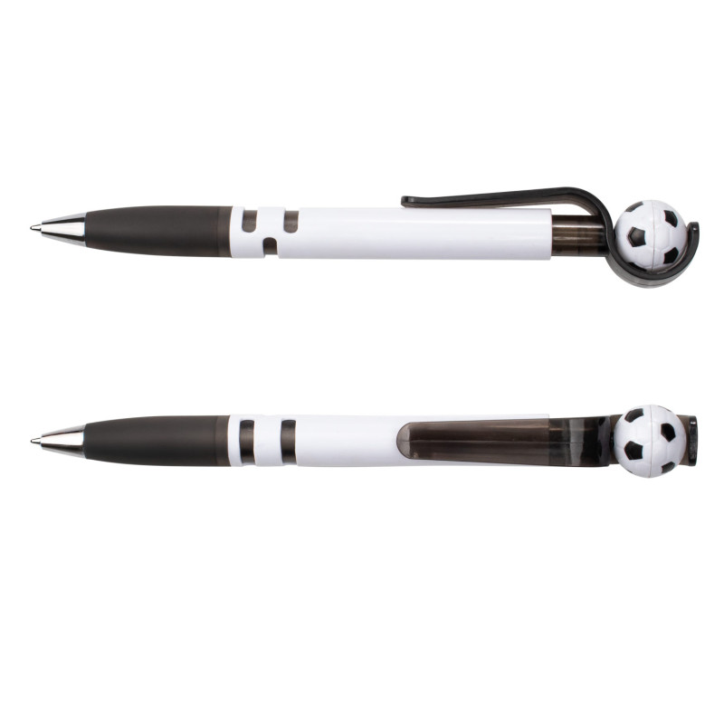 Con barril blanco sólido, clip y empujador traslúcidos que integran un mecanismo giratorio con balón de fútbol. Su empuñadura traslúcida brinda comodidad al escribir, mientras que la punta cromada aporta un toque moderno. El balón gira al impulsarlo, haciendo de este bolígrafo una opción divertida y funcional.