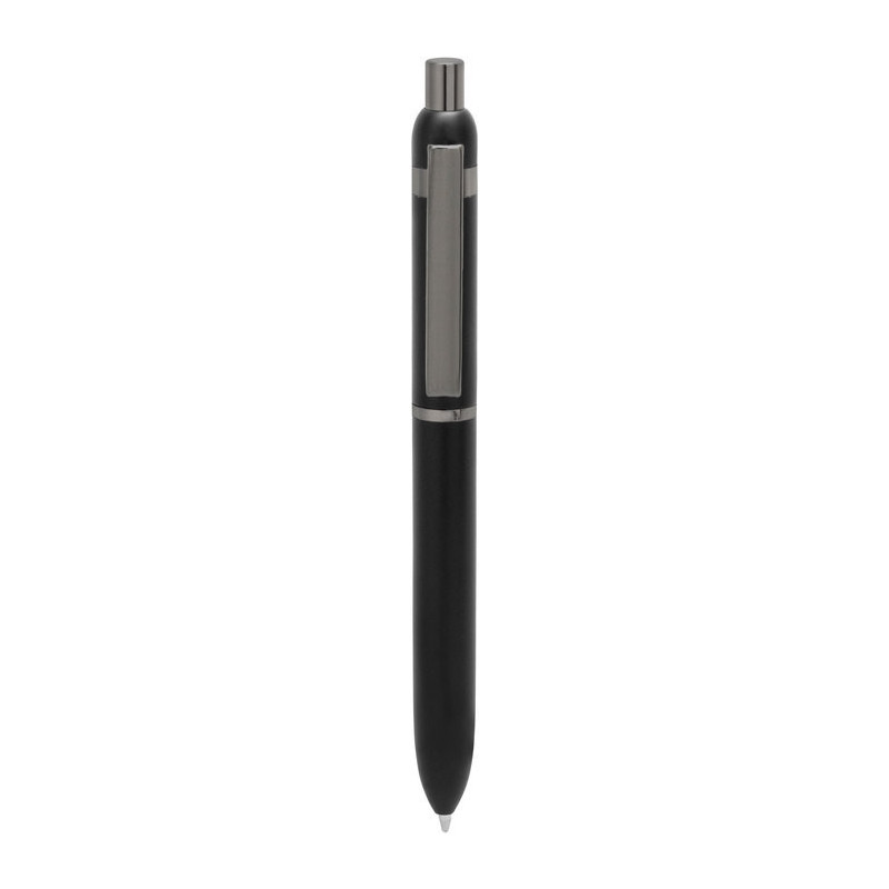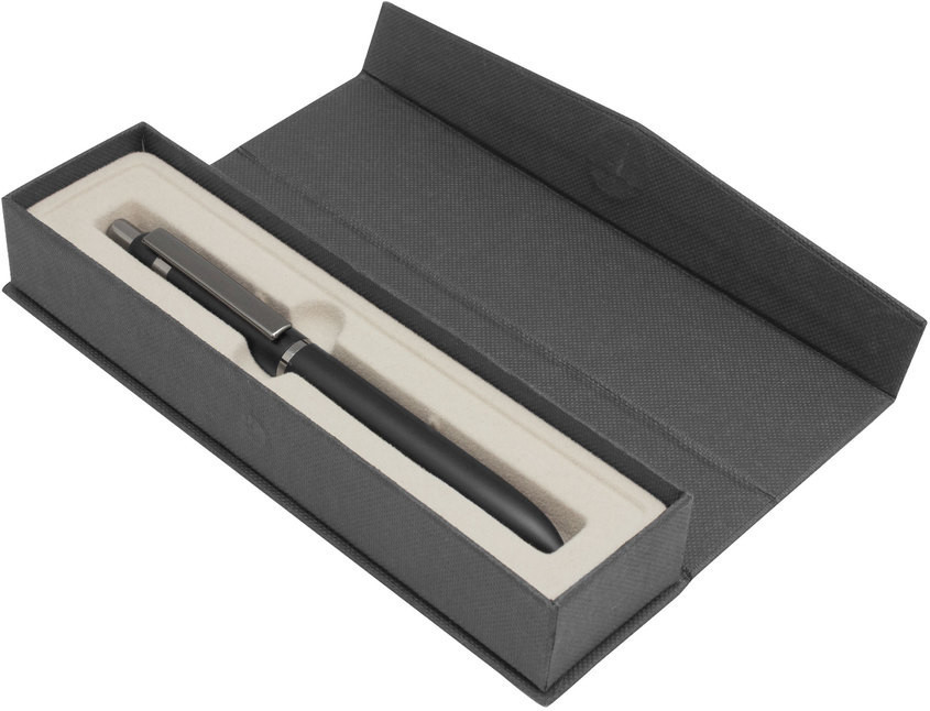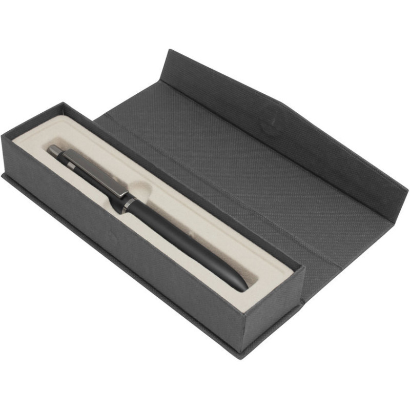 Bolígrafo retráctil. Clip, botón y anillos metálicos color plata. Tinta Negra. Destape color plata tanto en el cuerpo como en la tapa. Presentación en estuche con cierre magnético.