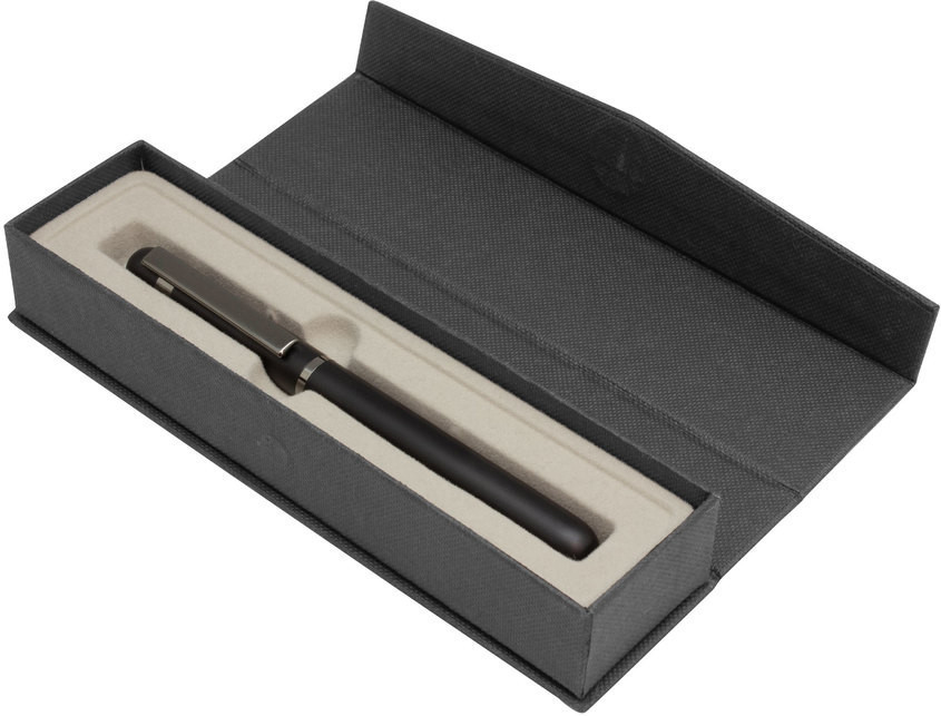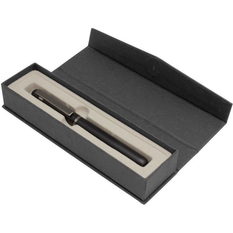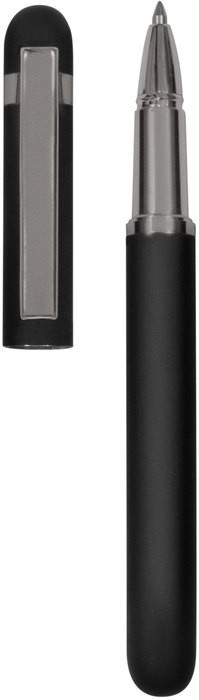 Bolígrafo roller. Apertura con tapa a presión. Clip y anillos metálicos color plata. Tinta Negra. Destape color plata tanto en el cuerpo como en la tapa. Presentación en estuche con cierre magnético.