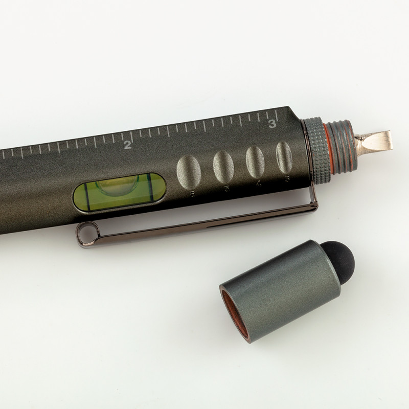 Bolígrafo plástico con clip metálico y stylus. Incluye regla de 7 cm, 1 nivelador, 1 destornillador de pala y 1 de estrella.