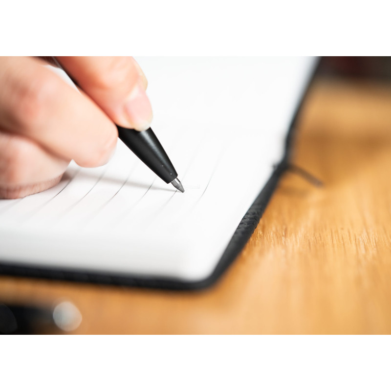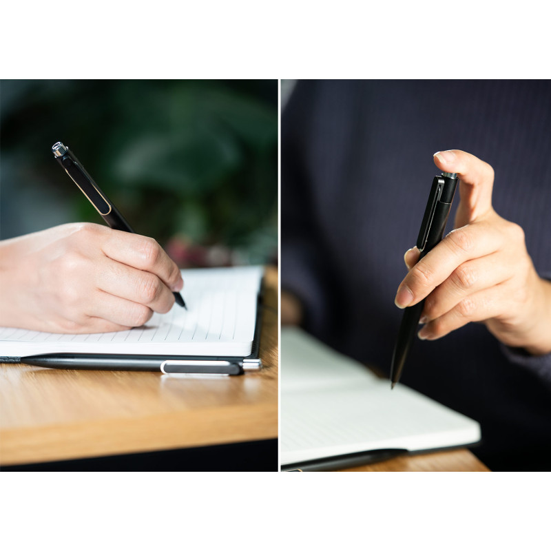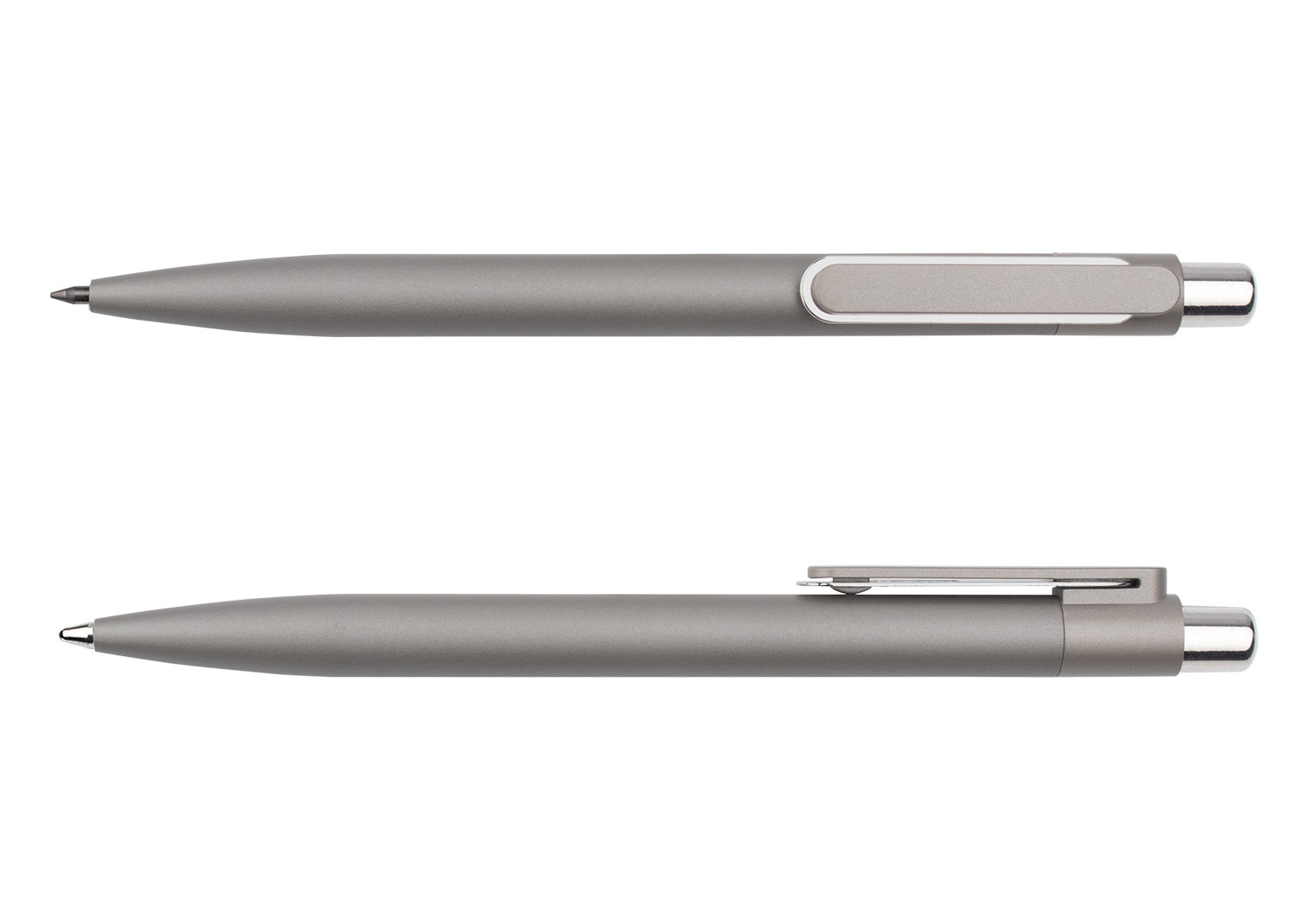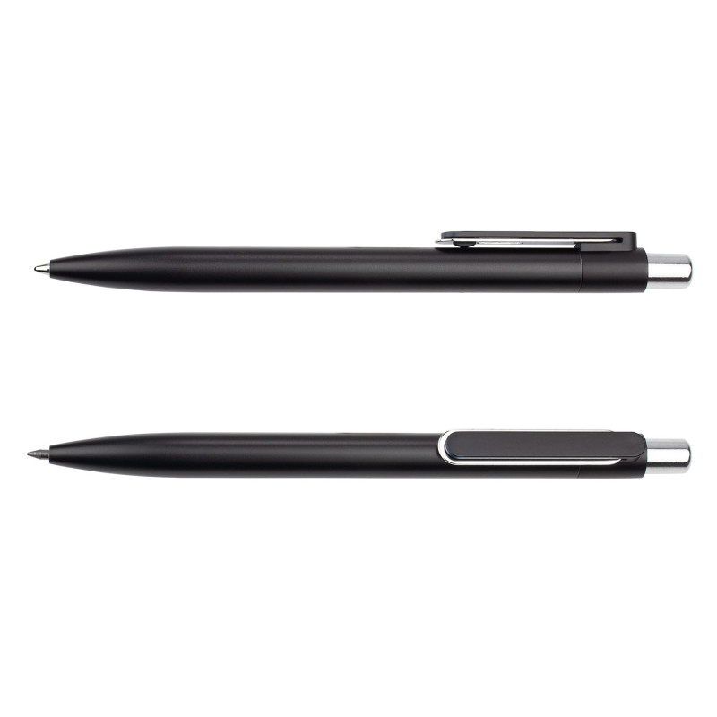 Bolígrafo retráctil de aluminio reciclado, más un lápiz externo de aluminio reciclado empaquetados en caja de cartón negra que se desliza para abrir. (Bolígrafo/Esfero)