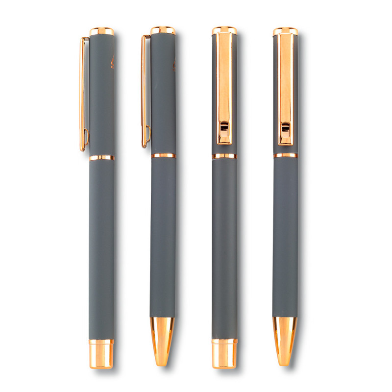 Set de bolígrafos metálicos tipo roller y mecanismo twist. Empaque caja individual.