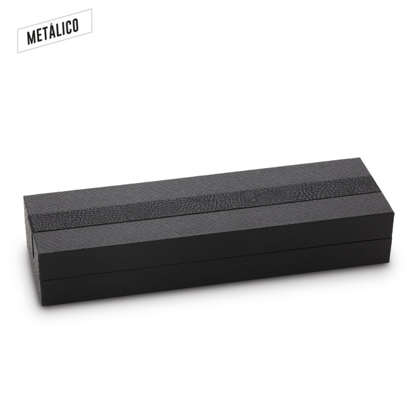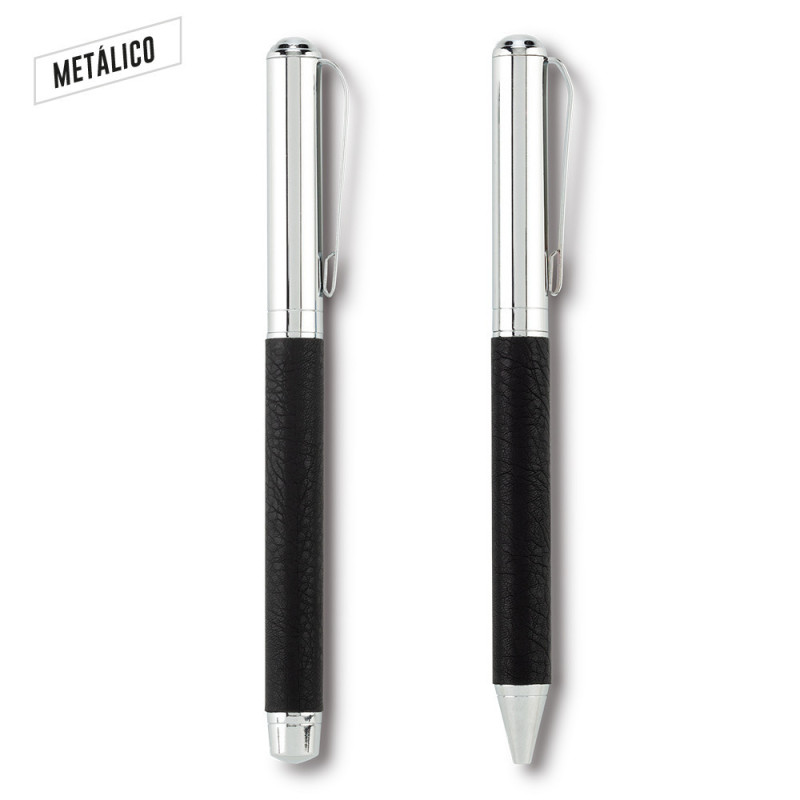Set de bolígrafo y roller metálico con partes en poliuretano imitación cuero en estuche. Empaque caja individual. Medidas: Estuche: 17.8 cm x 5.5 x 3 cm. Bolígrafo: 13.5 cm . Marca: Estuche: 4.5 cm / Tampografía - Bolígrafo: 3 cm / Láser barril superior.