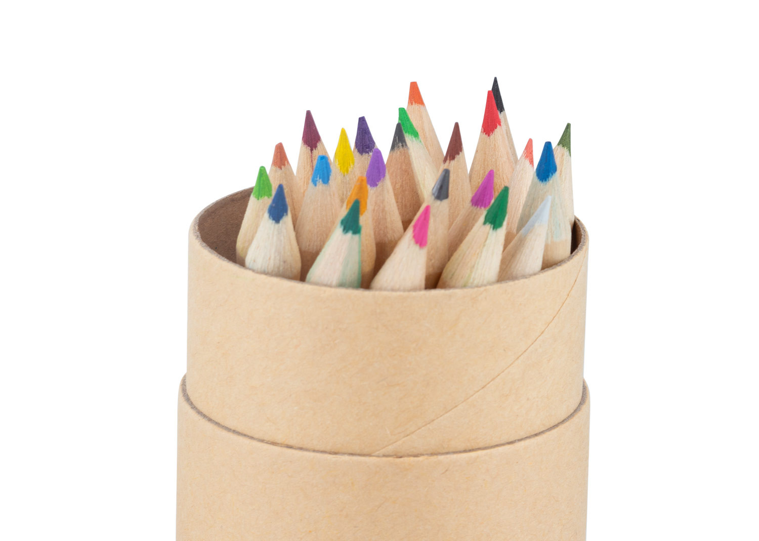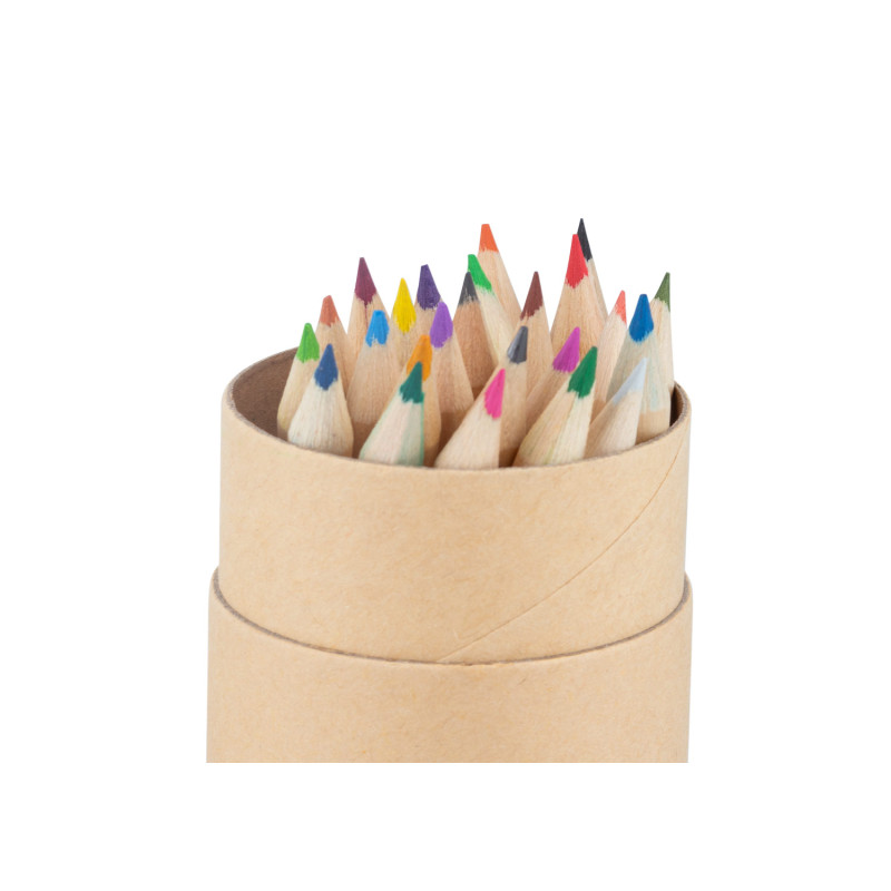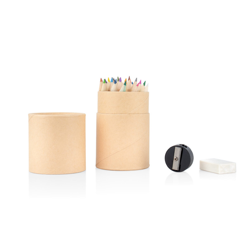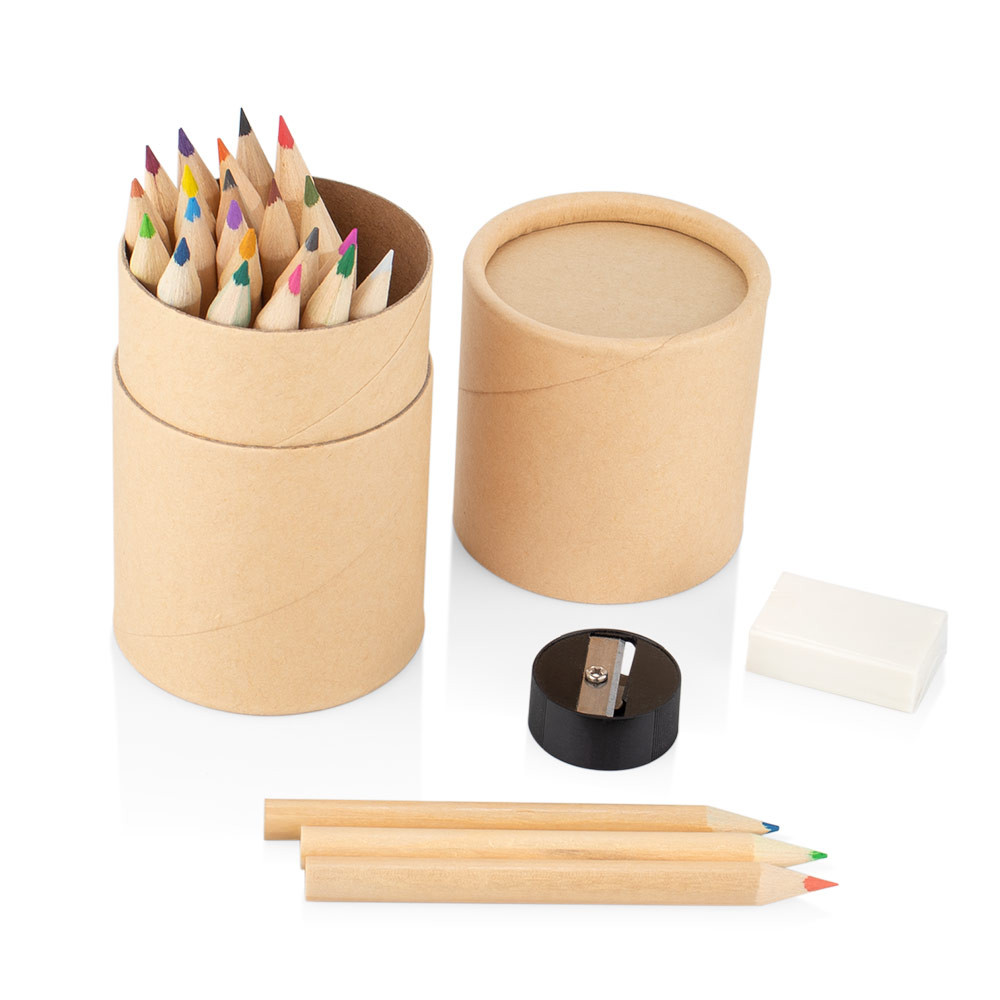 Este juego incluye 24 lápices de colores (8,7 X Ø 0,3) presentados en una caja de cartón, que además incorpora un sacapuntas (1,1 X Ø 2) y una goma de borrar (3,6 X 1,9 X 1,3) en su interior. Es una solución práctica y completa para actividades creativas, ideal para mantener todo lo necesario en un solo empaque.
