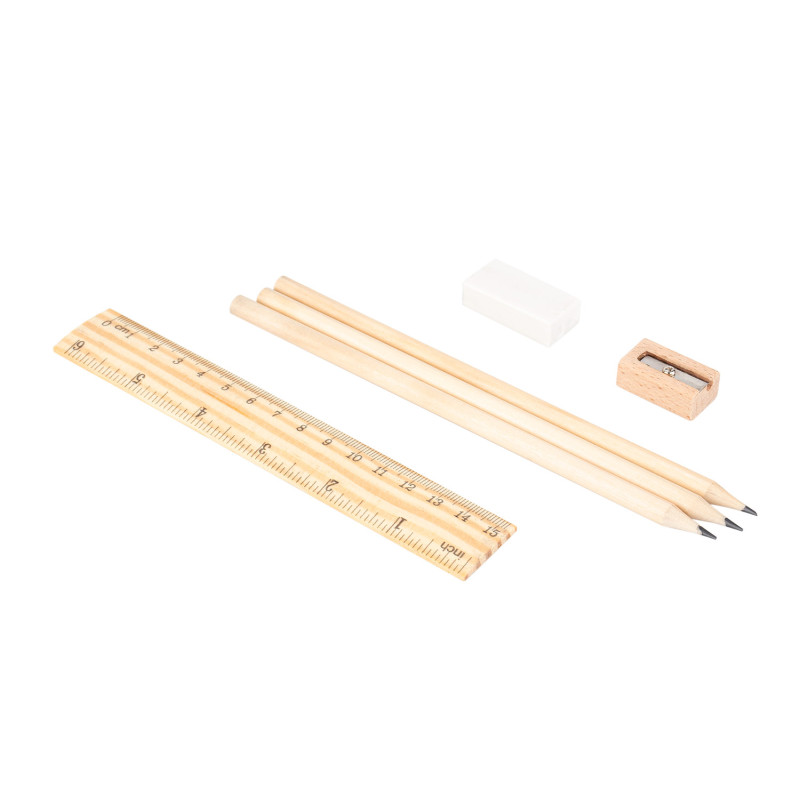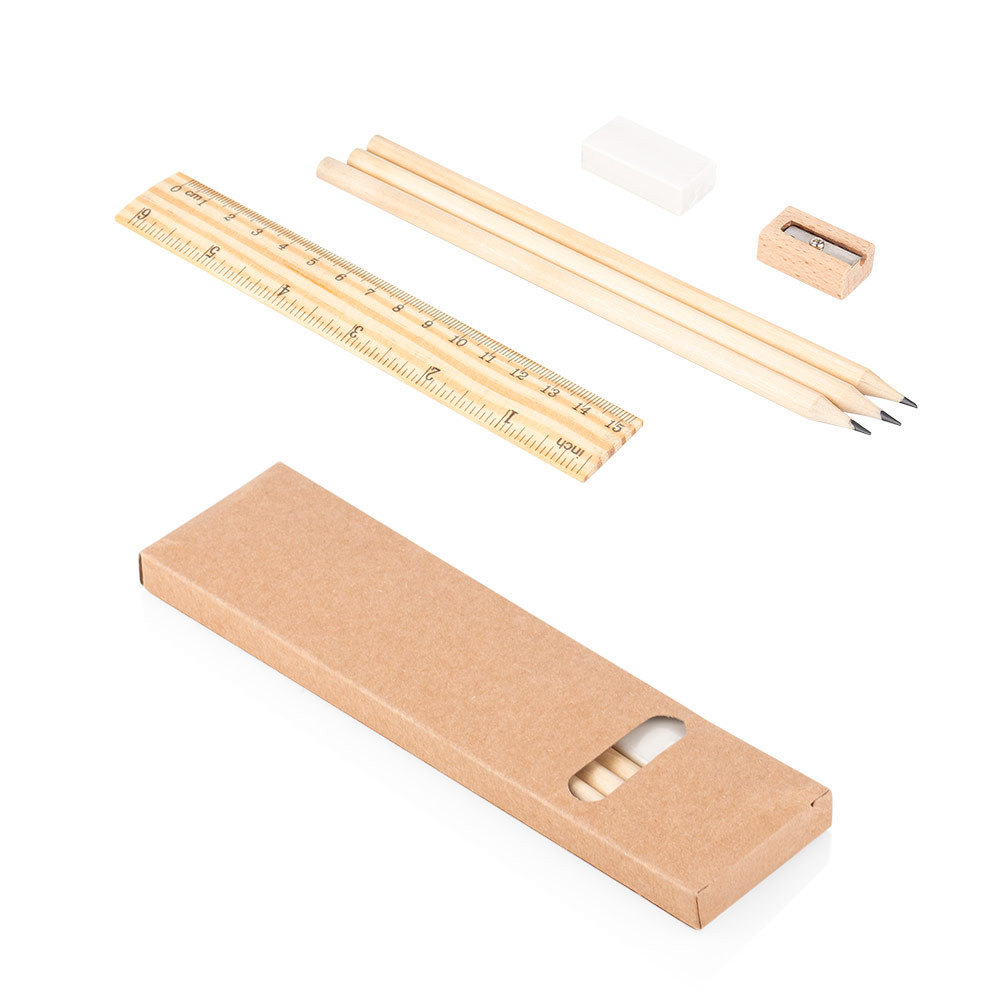 Este juego de lápices viene en una caja de papel que incluye tres lápices (17,7 X Ø 0,4), una regla de madera con medidas en centímetros (15) y pulgadas (6"), un sacapuntas (1,6 X 2,7 X 1,1) y borrador (3,5 X 1,9 X 1) en su interior. Es una opción práctica y compacta para llevar lo esencial de papelería en un solo estuche.