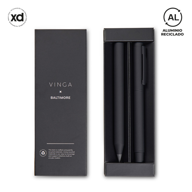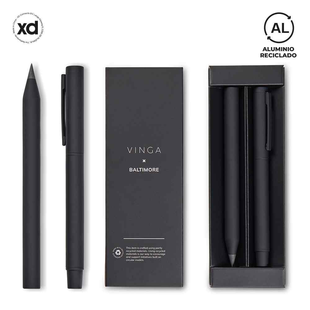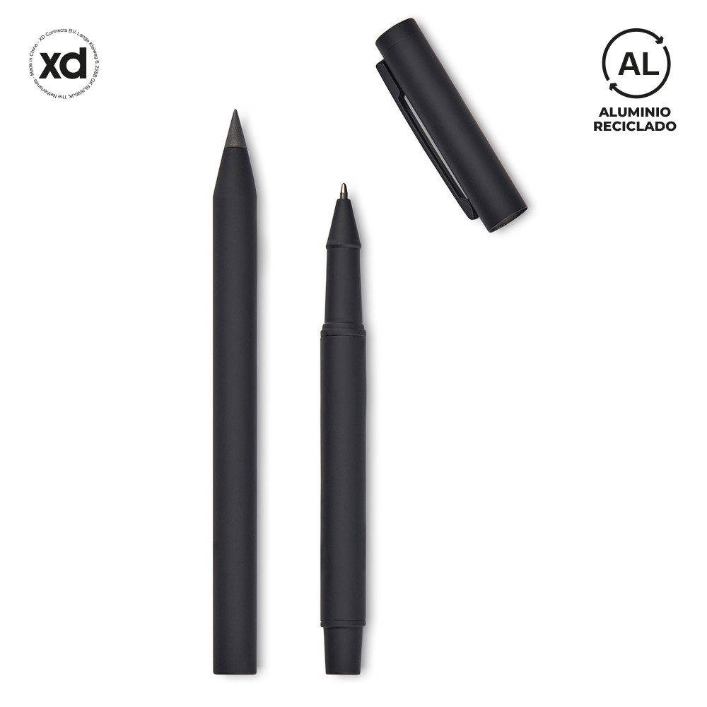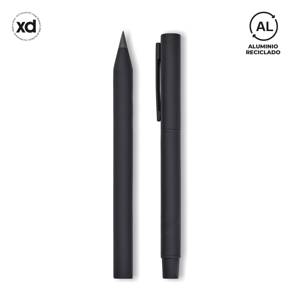 Set de bolígrafo en aluminio reciclado con tapa y lápiz con mina infinita (mina eterna). Empaque caja individual.