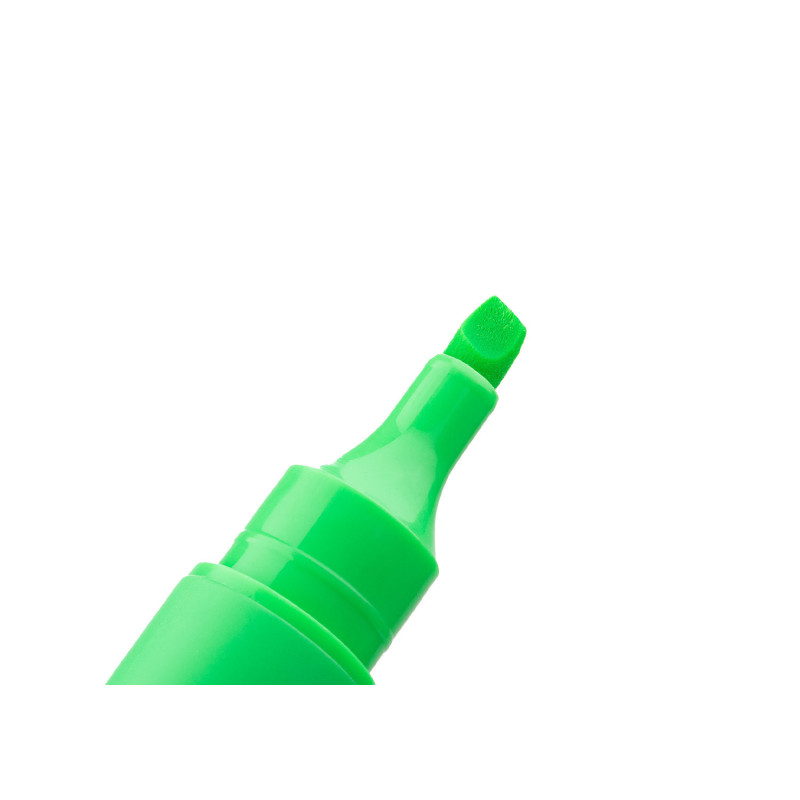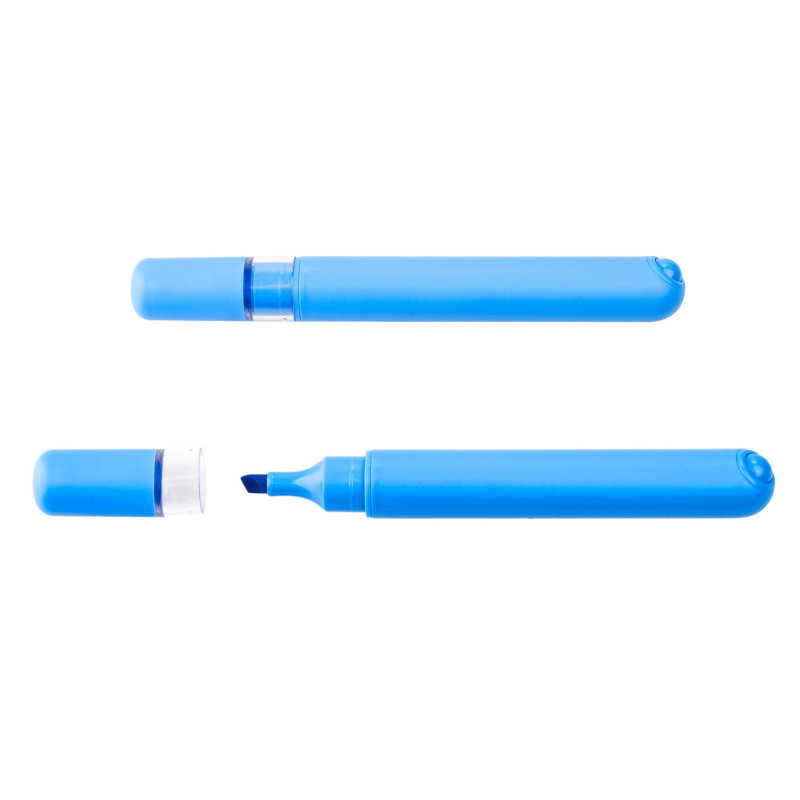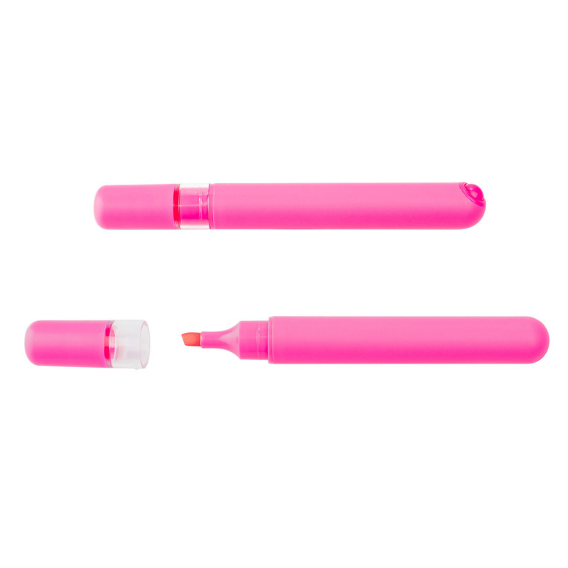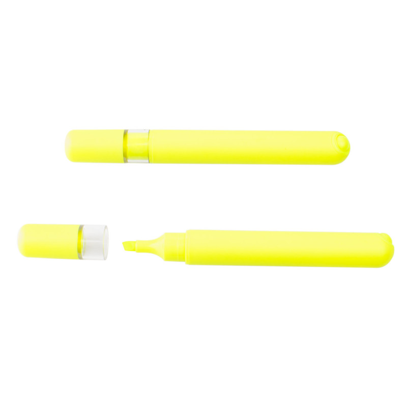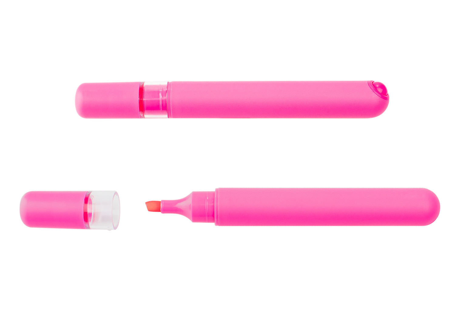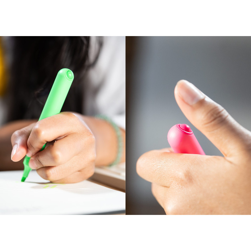 Resaltador plástico con cuerpo de color sólido con ribete transparente.