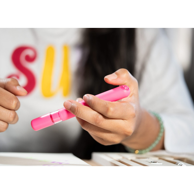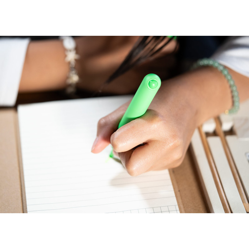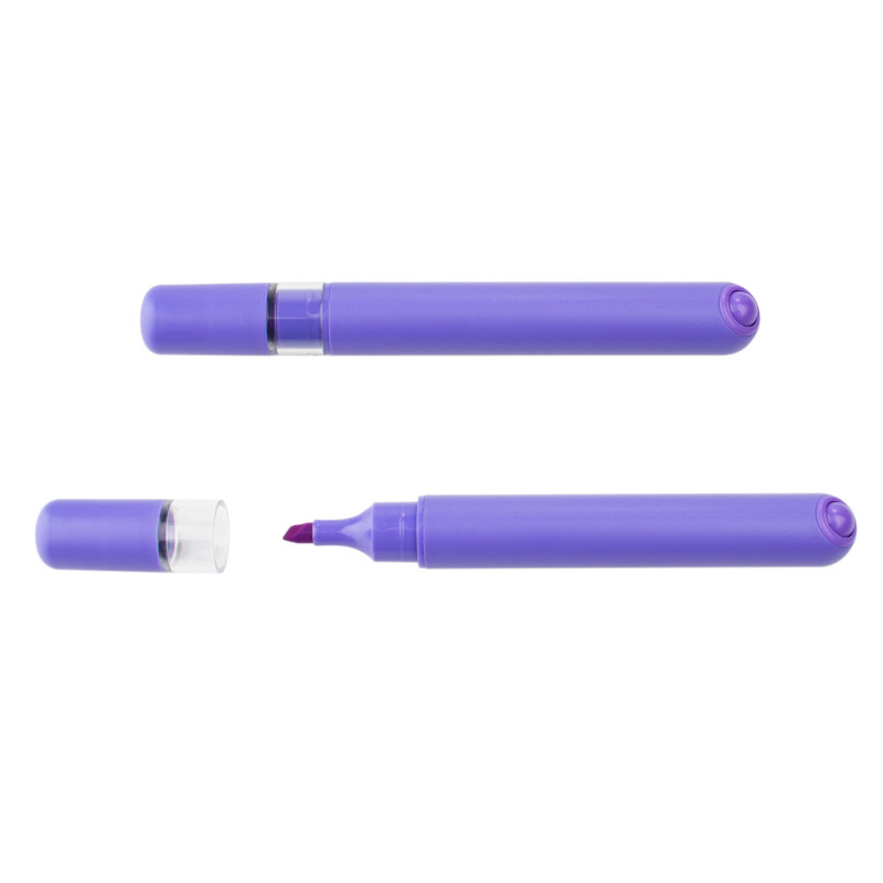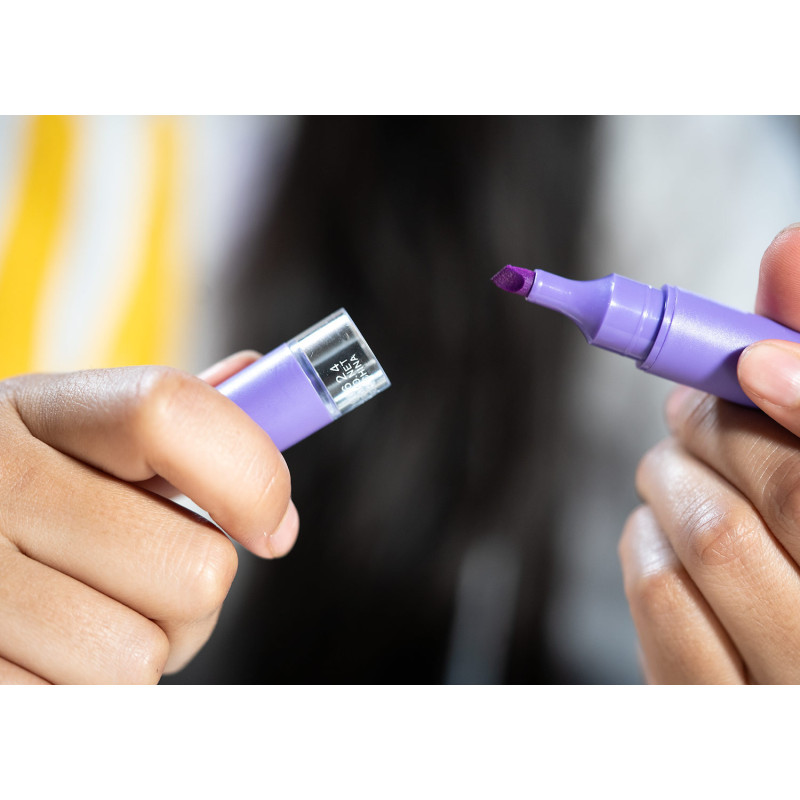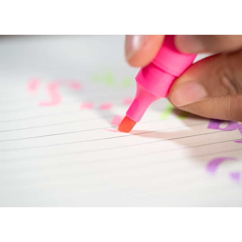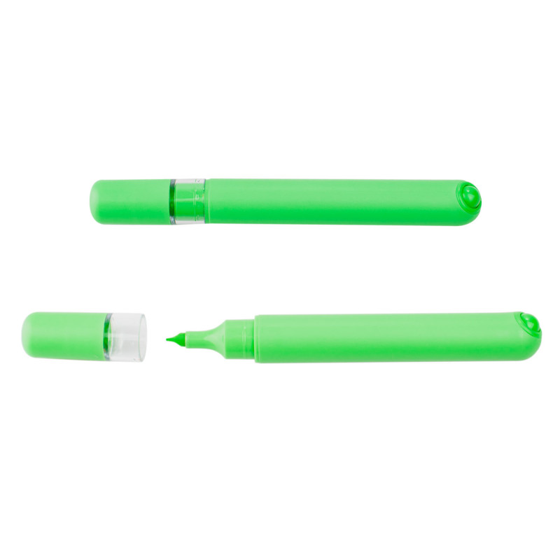 Resaltador plástico con cuerpo de color sólido con ribete transparente.